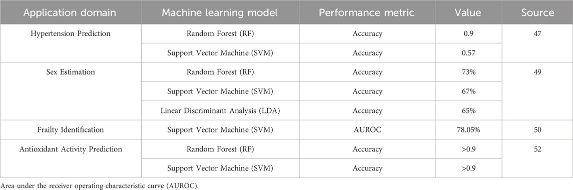 The application of machine learning (ML) models in predicting the risk of physical restraints in elderly patients has gained traction due to their ability to analyze complex datasets and identify patterns that may not be evident through traditional statistical methods. Among the various machine learning algorithms, Random Forest (RF) and Support Vector Machines (SVM) have emerged as prominent tools in this domain (Ogutu et al., 2011; Siemers and Bajorath, 2023). RF, a tree-based ensemble learning method, excels at handling high-dimensional data and is particularly effective in managing the variability and nonlinearity commonly found in clinical datasets. In studies predicting outcomes such as postoperative delirium and fall risk in elderly patients, RF has demonstrated exceptional performance. For instance, in hypertension prediction research, RF achieved an accuracy of 0.90 (Turnbull et al., 2024), while in athletic identification studies, it reached an accuracy of 0.92 (Estrella and Capdevila, 2025), demonstrating high accuracy and robust predictive capabilities. Furthermore, in sex estimation tasks, RF achieved an accuracy of 73% (Syed et al., 2025), further confirming its advantages in clinical prediction. On the other hand, SVM, which excels at finding optimal hyperplanes to separate different classes in high-dimensional spaces, has also shown promising results in various applications, including predicting suicide risk and other adverse outcomes in elderly populations. For example, in frailty identification studies, SVM achieved an AUROC of 78.05% (Chou et al., 2024); in athletic identification research, it reached an accuracy of 0.84 (Estrella and Capdevila, 2025); and in music familiarity classification, it achieved an accuracy of 67% (Kim et al., 2024), highlighting its applicability across different scenarios. Comparative analysis of these algorithms indicates that while both RF and SVM can achieve high predictive accuracy, their performance may vary depending on the specific characteristics of the dataset and the nature of the prediction task. For example, in hypertension prediction studies, RF’s accuracy (0.90) was significantly higher than SVM’s (0.57) (Turnbull et al., 2024), and in sex estimation research, RF’s accuracy (73%) also outperformed SVM’s (67%) (Syed et al., 2025), suggesting that RF often surpasses SVM in terms of AUC, indicating better overall model performance. However, SVM demonstrates effectiveness in scenarios with smaller sample sizes or when data is non-linearly separable. For instance, in antioxidant activity prediction, both SVM and RF achieved accuracy exceeding 0.9 (Jung et al., 2024), showcasing SVM’s versatility in handling diverse clinical datasets. Future research should focus on refining these models, incorporating larger and more diverse datasets, and ensuring their clinical applicability through rigorous external validation. Table 1 summarizes the performance of various machine learning models across multiple application domains.