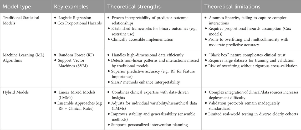 The integration of clinical rules with data-driven methods using mixed models and ensemble techniques has significantly advanced risk prediction in medical conditions, particularly for the elderly. Mixed models, especially linear mixed models (LMMs), effectively manage hierarchical data and individual variability, enhancing prediction accuracy by adjusting for confounding variables (Tirrell et al., 2018). Recent studies highlight the superiority of mixed models in predicting chronic disease outcomes and the benefits of ensemble methods like random forests and gradient boosting in improving prediction stability and generalizability for elderly care, ultimately supporting personalized interventions and optimizing healthcare for aging populations (Ng et al., 2018; Griesbach et al., 2021). Table 2 summarizing the various risk prediction models.