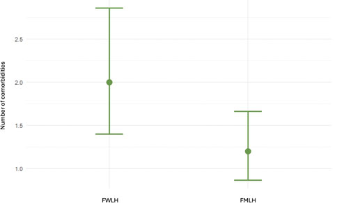 Figure 2. Comparison of the number of comorbidities between FWLH and FMLH. FWLH, foreign-born women living with HI, FMLH, foreign-born men living with HI. Mean and SD.