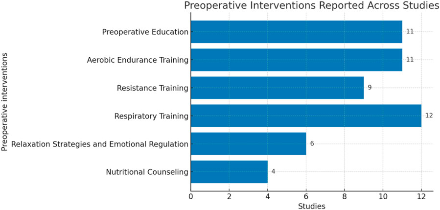 Concerning the interventions included in the Functional Respiratory Reeducation category, nine studies (Lai et al., 2017a; Lai et al., 2017b; Yang et al., 2018; Liu et al., 2020; Huang et al., 2024; Sebio et al., 2017; Fernández-Blanco et al., 2023; Tenconi et al., 2021; Kökez et al., 2023) referenced them in the preoperative period. The interventions mentioned in this category include awareness and respiratory control (Yang et al., 2018; Tenconi et al., 2021), diaphragmatic breathing (Lai et al., 2017b; Yang et al., 2018; Huang et al., 2024; Fernández-Blanco et al., 2023; Kökez et al., 2023), coastal reeducation (Kökez et al., 2023), incentive spirometry (Lai et al., 2017a; Lai et al., 2017b; Liu et al., 2020; Sebio et al., 2017; Fernández-Blanco et al., 2023; Kökez et al., 2023), training with balloon blowing (Liu et al., 2020; Huang et al., 2024; Liu et al., 2024), and expiration with pursed lips (Huang et al., 2024; Liu et al., 2024; Kökez et al., 2023). Additionally, mechanisms for clearing the airways, such as specifically directed cough (Yang et al., 2018; Liu et al., 2020; Kökez et al., 2023), active cycle of respiratory techniques (Yang et al., 2018), and cough with wound containment (Liu et al., 2024; Fernández-Blanco et al., 2023), were included.