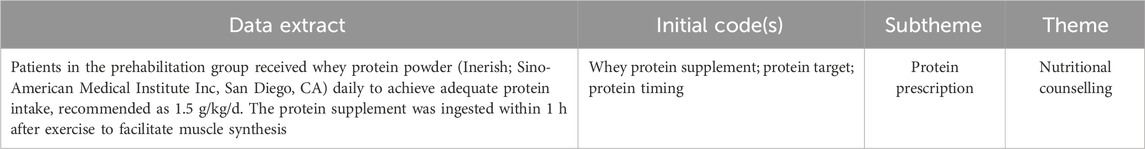A thematic analysis of the included articles was conducted, following the six-phase approach of Braun and Clarke (2006), to synthesize the intervention content reported across studies. (1) Familiarization: two reviewers read full texts and extracted verbatim descriptions of interventions. (2) Generating initial codes: working primarily at a semantic level, and where appropriate at a latent level, reviewers independently coded extracts into an evolving codebook. (3) Searching for themes: codes were iteratively clustered into higher-order categories representing meaningful components of prehabilitation. (4) Reviewing themes: candidate themes were checked against coded extracts and the full dataset; boundaries were refined to avoid overlap and to ensure internal coherence. (5) Defining and naming themes: we produced clear operational definitions for each theme and subtheme. (6) Producing the report: a final thematic map and narrative were generated, supported by summary tables that align each component across studies. To illustrate the coding pathway, an example is provided in Table 2.
