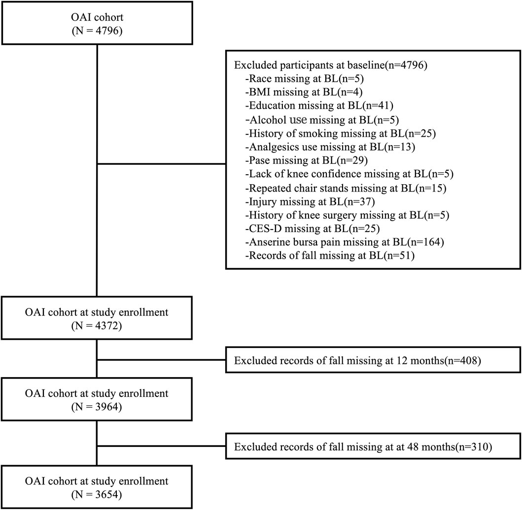 The following variables were assessed at baseline visit: age, BMI, gender, race, education, history of smoking, alcohol use, analgesics use, history of fall, PASE, repeated chair stands, knee confidence, history of knee injury, history of knee surgery, and CES-D. Race was categorized as Caucasian or non-Caucasian, BMI as either normal or obese, education as postgraduate or non-postgraduate, and smoking status as current versus never-smokers. The repeated chair stands assessment required participants to complete a minimum of five repetitions. The knee confidence questionnaire, derived from the Knee Injury Osteoarthritis Outcome Score, asked respondents, “How much are you troubled with a lack of confidence in your knees?” (Sharma et al., 2015). A history of knee injury was defined as an incident that severely impaired the participant’s walking capacity for at least 1 week.