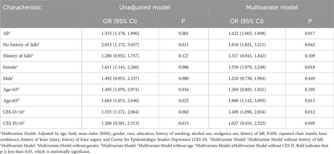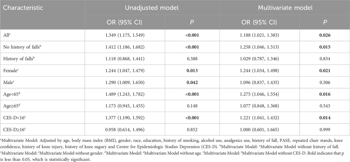 Table 2 elucidates the relationship between the presence of ABP at baseline and incident falls within a 24-month period, examined both in the overall population and within stratified subgroups. The analysis of incident falls as an outcome indicates that ABP participants are more likely to experience incident falls than those without ABP ([OR]: 1.349, 95% confidence interval [CI]: 1.175–1.549, p < 0.001). Following the adjustment for baseline variables such as age, BMI, gender, race, education level, smoking status, alcohol consumption, analgesic use, prior fall history, PASE, repeated chair stands, knee confidence, prior knee injury, knee surgery history, and CES-D scores, the association between baseline ABP and incident falls within 24 months remained statistically significant (OR: 1.188, 95% CI: 1.021–1.383, p = 0.026). When stratifying by baseline fall history, among individuals with no prior fall history, participants with ABP exhibited a 1.412-fold higher odds of incident falls over the 2-year follow-up compared to those without ABP (95% CI: 1.186–1.682, P < 0.001). Even after controlling for confounding factors, those with ABP maintained a 1.258-fold higher odds of incident falls over the 2-year follow-up relative to their non-ABP counterparts (95% CI: 1.046–1.513, P = 0.015). Furthermore, when stratified by gender, age, and CES-D scores, patients with ABP younger than 65 years and with CES-D scores below 16 demonstrated a 1.489-fold (95% CI: 1.243–1.782, P < 0.001) and a 1.377-fold (95% CI: 1.190–1.592, P < 0.001) higher odds of incident falls over the 2-year follow-up, respectively, compared to participants without ABP. However, among those aged 65 years and older at baseline, as well as those with CES-D scores of 16 or higher, no significant association was identified between ABP and incident falls. After adjusting for confounding variables, the risk of incident falls for ABP patients younger than 65 years and with CES-D scores below 16 remained 1.275 times (95% CI: 1.046–1.554, P = 0.016) and 1.221 times (95% CI: 1.041–1.432, P = 0.014) higher, respectively, compared to non-ABP participants. Moreover, among female patients with ABP, the adjusted analysis indicated an increased likelihood of incident falls (OR: 1.244, 95% CI: 1.034–1.498, p = 0.021). However, there was no significant association established between ABP and incident falls among participants who were aged 65 or older at baseline, had CES-D scores of 16 or higher, or were male, even after accounting for confounding variables.