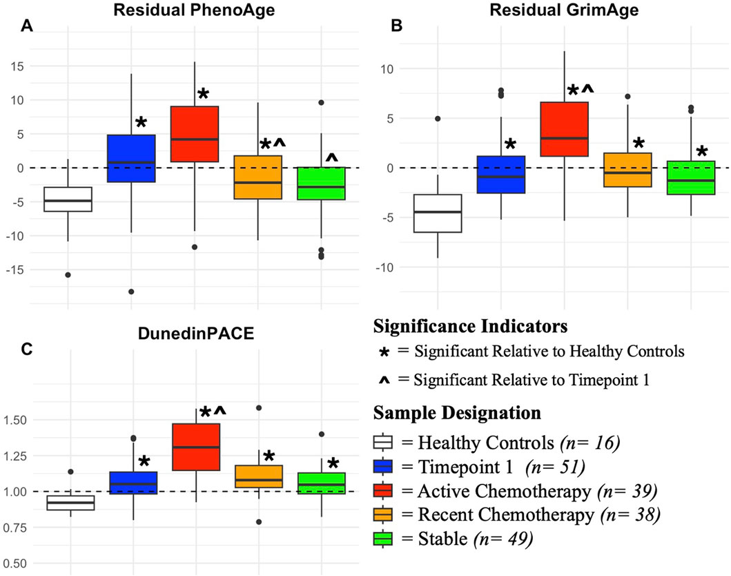 Box plots displaying residual PhenoAge, GrimAge, and DunedinPACE for different sample groups: healthy controls, timepoint 1, active chemotherapy, recent chemotherapy, and stable. Significant differences are marked with asterisks and carets, indicating comparisons relative to healthy controls and timepoint 1. Sample sizes are noted for each group.