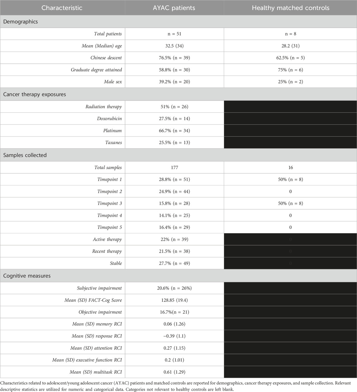 In total, 51 AYAC patients and 8 non-cancer controls were recruited for the study. Mean age was slightly higher amongst AYAC patients (32.5 years old AYAC vs. 28.1 HC), with most of both populations having received a college degree (AYAC: 58.8% and HC: 75%), being of Chinese descent (AYAC: 76.5% and HC: 62.5%), and female (AYAC:60.8% and 25%) (Table 1). Amongst all AYAC patients, 51% received radiation therapy (n = 26), with platinum compounds the most common chemotherapy exposure (66.7%, n = 34), followed by doxorubicin (27.5%, n = 14), and taxanes (25.5%, n = 13).
