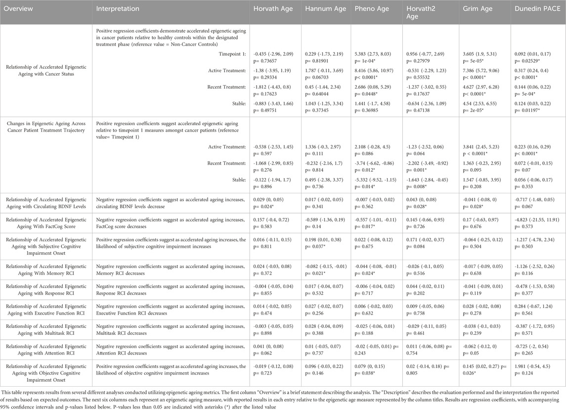 Table 2. Relationship of Epigenetic Ageing Measures with Cancer Status, Treatment Status, Circulating BDNF Levels, and Cognitive Function Outcomes.