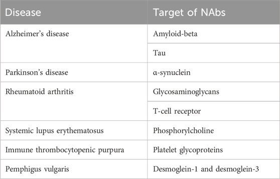 Natural autoantibodies (NAbs), a fundamental component of the immune system, are immunoglobulin glycoproteins produced especially by a subtype of B lymphocytes, B-1 cells, in the absence of specific antigenic stimulation (Kaveri and Bayry, 2017; Lobo, 2017). These antibodies, like the autoantibodies that emerge in various immunopathological conditions, utilize the same genetic elements as antibodies targeting environmental antigens. Avrameas suggests that NAbs, by interacting with the vast array of self-components present in an organism, establish a broad and dynamic network that contributes to the body’s overall homeostasis (Avrameas, 1991). NAbs, often belonging to the IgM isotype at low affinity (IgM-NAbs), but also IgG and IgA in smaller percentages, are encoded by genes present in the germline in the variable region and are distinguished by a broad reactivity, recognizing both self and non-self antigens (Kaveri and Bayry, 2017; Lobo, 2017; Kaveri, 2012; Grönwall and Silverman, 2014). They act as a first line of defence against invading pathogens and play a crucial role in maintaining immune homeostasis (Ochsenbein et al., 1999; Miescher and Käsermann, 2013; Avrameas et al., 2018). NAbs maintain tissue homeostasis and play a protective role in bacterial and viral infections, chronic inflammatory diseases, cardiovascular disorders, and neurodegenerative conditions. These biological activities of NAbs can also be observed following intravenous immunoglobulin (IVIg) administration and may contribute at various levels to their disease-protective effects (Avrameas and Selmi, 2013). NAbs levels and their repertoire can vary between healthy individuals and under pathological conditions, influencing the inflammatory response (Grönwall and Silverman, 2014). Table 1 shows NAbs and their targets detected in selected diseases.