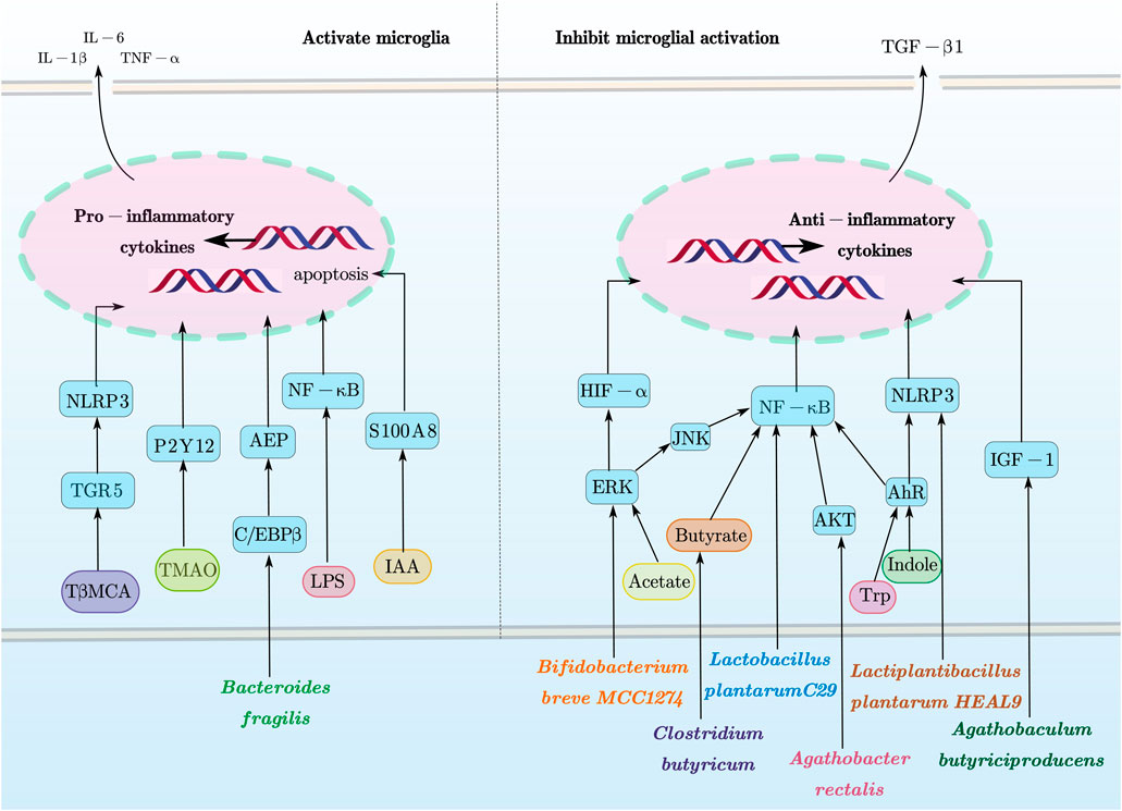 Agathobacter rectalis is a bacterium belonging to the phylum Firmicutes and is a common member of the human gut microbiota. It belongs to the genus Agathobacter within the family Lachnospiraceae. A study found that the abundance of Agathobacter is significantly lower in AD patients and is negatively correlated with cognitive impairment. Subsequent animal experiments demonstrated that Agathobacter rectalis and its metabolite butyrate effectively inhibited the activation of microglia in APP/PS1 mice by modulating the AKT/NF-κB pathway, reducing the production of pro-inflammatory cytokines, and thereby alleviating neuroinflammation (Lv et al., 2024). The direct effects of gut microbiota on microglia are summarized in Table 1.