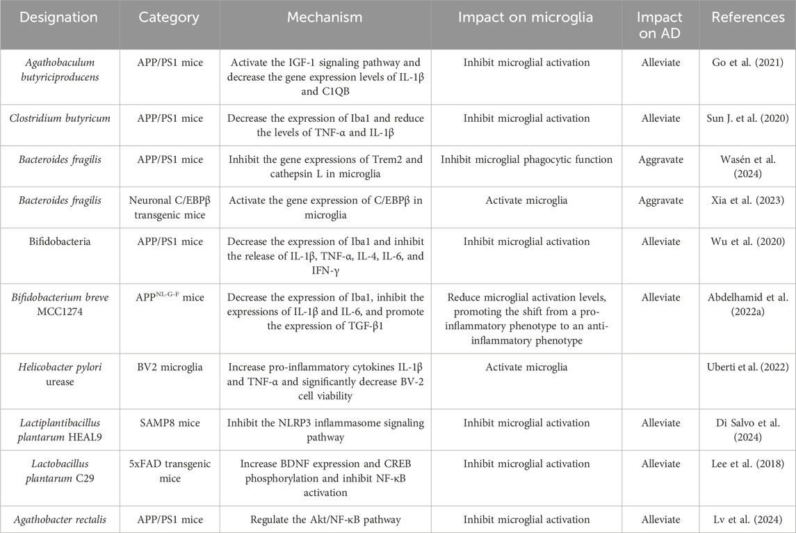 Bifidobacteria are Gram-positive, anaerobic or microaerophilic bacteria belonging to the phylum Actinobacteria. A study demonstrated that a 6-month treatment with bifidobacteria reduces Aβ deposition in the brains of APP/PS1 mice, inhibits the activation of microglia, and decreases the release of inflammatory factors such as IL-1β, IL-6, tumor necrosis factor-alpha (TNF-α), interleukin-4 (IL-4), and interferon-gamma (IFN-γ), thereby attenuating neuroinflammation (Wu et al., 2020). Bifidobacterium breve MCC1274 (B. breve MCC1274) reduces the number and activation of microglia in the hippocampus of mice and may promote the transition of microglia from a pro-inflammatory phenotype to an anti-inflammatory phenotype, thereby exerting neuroprotective effects (Abdelhamid et al., 2022a). Additionally, multiple studies have shown that bifidobacteria can inhibit the polarization of microglia, alleviate neuroinflammation, and improve cognitive deficits (Zhu et al., 2023; Abdelhamid et al., 2022b). Mariano et al. examined plasma homocysteine levels, serum folate and vitamin B12 concentrations, plasma pyridoxal phosphate levels, C-reactive protein, and antibodies of immunoglobulin G (IgG) and immunoglobulin A (IgA) against Helicobacter pylori (HP) in 30 AD patients and found an association between HP infection and AD (Malaguarnera et al., 2004). Urease (HPU) is an enzyme produced by HP. A previous study demonstrated that HPU-treated BV2 microglia produce reactive oxygen species (ROS) and cytokines IL-1β and TNF-α while exhibiting reduced cell viability. After intraperitoneal injection of HPU in rats, excessive expression of the microglial activation marker Iba1 was observed, but HPU was not detected in brain homogenates. It was concluded that HP infection might affect AD by inhibiting microglial activation through its urease production (Uberti et al., 2022).