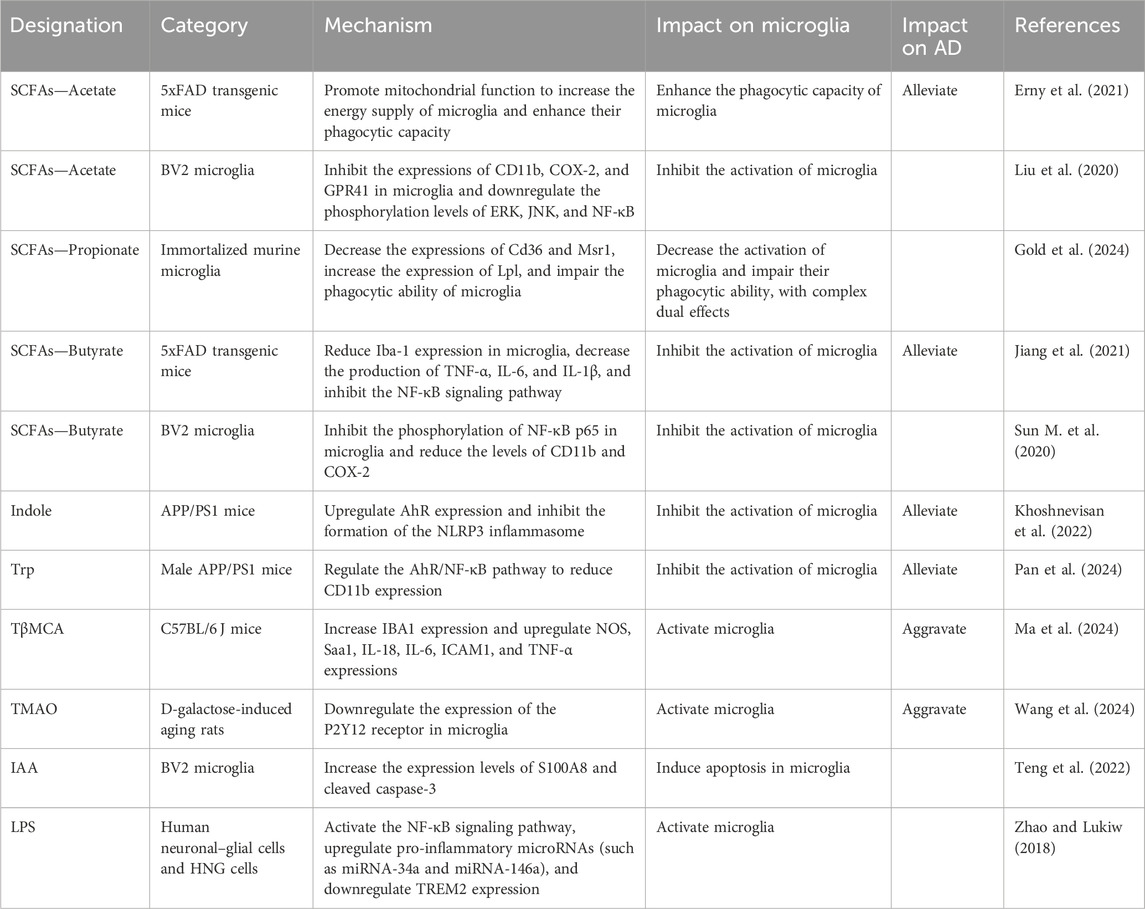LPS is not a direct derivative of the gut microbiota but a unique component of the cell wall of Gram-negative bacteria. When Gram-negative bacteria in the intestinal microbiota undergo cell death and lysis, LPS is released into the gut environment, subsequently entering the bloodstream. Multiple lines of evidence suggest that aging combined with recurrent chronic infections can lead to exposure to exotoxins such as LPS and bacterial amyloid proteins, which can alter the activation of microglia, exacerbate inflammatory responses, and lead to Aβ fibrillation in the brain, thereby contributing to the pathogenesis of AD (Kesika et al., 2021). In particular, lipopolysaccharide secreted by Bacteroides fragilis (BF-LPS) can activate the inflammatory transcription factor NF-κB, thereby promoting the occurrence of inflammatory neurodegenerative diseases (Lukiw, 2016). Additionally, it can upregulate pro-inflammatory microRNAs (such as miRNA-34a and miRNA-146a), which can downregulate the expression of triggering receptors expressed on myeloid cells 2 (TREM2), thereby exacerbating neuroinflammation and Alzheimer’s disease pathology (Zhao and Lukiw, 2018). The direct effects of gut microbiota derivatives on microglia are summarized in Table 2.