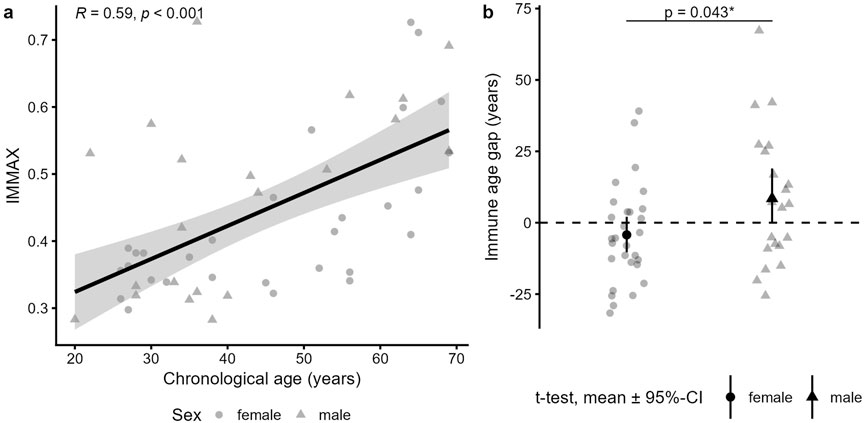 Figure 1. IMMAX and age gap description of the study participants. (a) Pearson correlation of the subjects’ (n = 50) chronological age und IMMAX (calculated as average IMMAX of the three time points t08, t13 and t18). (b) Immune age gap in female (n = 29) versus male (n = 21) subjects, tested by t-test.