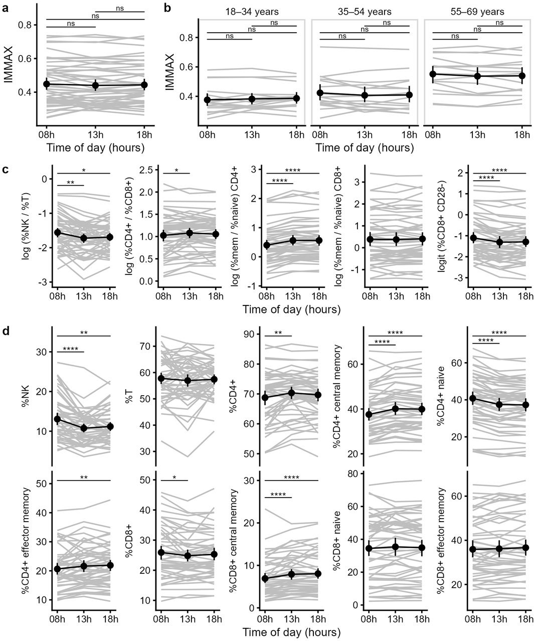 Figure 2. Diurnal trend of the IMMAX and its components. (a,b) Individual and mean IMMAX values from 8 a.m. to 6 p.m. of the total sample (a) or for the three different age categories (b). (c) Trends of the five IMMAX components, using log-transformed cell ratios and logit transformed CD28--CD8+ T cell percentages. (d) Values for the individual markers used to calculate the five IMMAX components over the three measuring time points. (a–d) Means and 95%-CI, P-values of pairwise comparisons with paired t-test adjusted for multiple testing; *P < 0.05, **P < 0.01, ***P < 0.001, ****P < 0.0001.