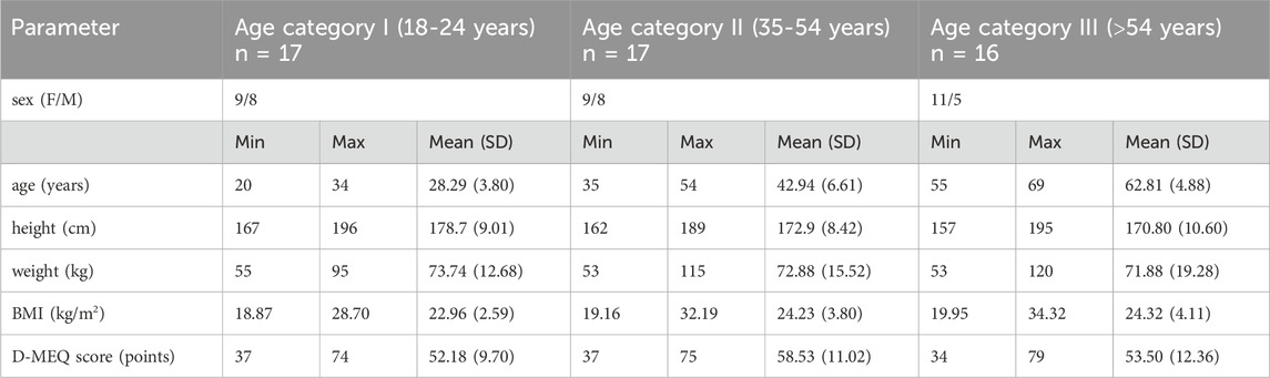 Of the 50 participants recruited, 36 were of normal weight, 10 were overweight (BMI 25-29,9 kg/m2), and 4 were obese (BMI >30 kg/m2). The chronotype classification resulted in 19 morning, 23 neutral and 8 evening types according to the D-MEQ questionnaire. The characteristics of the participants are shown in Table 1, with no significant group differences in sex, height, weight, BMI and D-MEQ score.