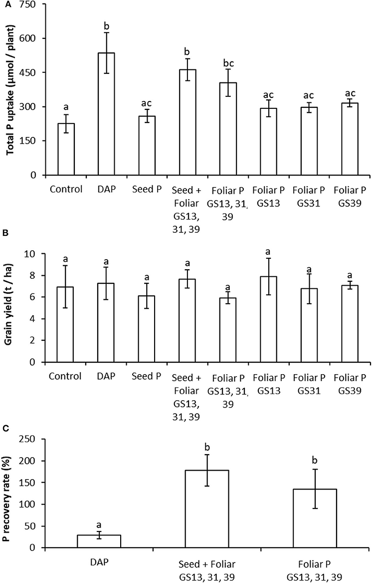 Figure 5. Combining foliar P application with seed P dressing can produce comparable yields of Triticum aestivum to soil P fertilization with greater P recovery rates over the untreated control in P-sufficient conditions. Panel (A): Total P content of wheat plants grown to maturity in 3 kg sandy loam soil. P-fertilization treatments were untreated controls, di-ammonium phosphate (DAP) granules placed in soil (885 μmol P plant−1); single or triple applications of foliar P (46.3 μmol P plant−1 application−1); seed dressings (3 μmol P plant−1) combined with three foliar applications (46.3 μmol P plant−1 application−1). Panel (B): Grain yields scaled to t ha−1 for the treatments reported in (A). Panel (C): Recovery rates of the applied P in the whole plant for the treatments that produced significant differences to the control in (A). Values represent means ± SEM (n = 4) with lowercase letters showing significant differences between treatments (p < 0.05; one-way ANOVA).