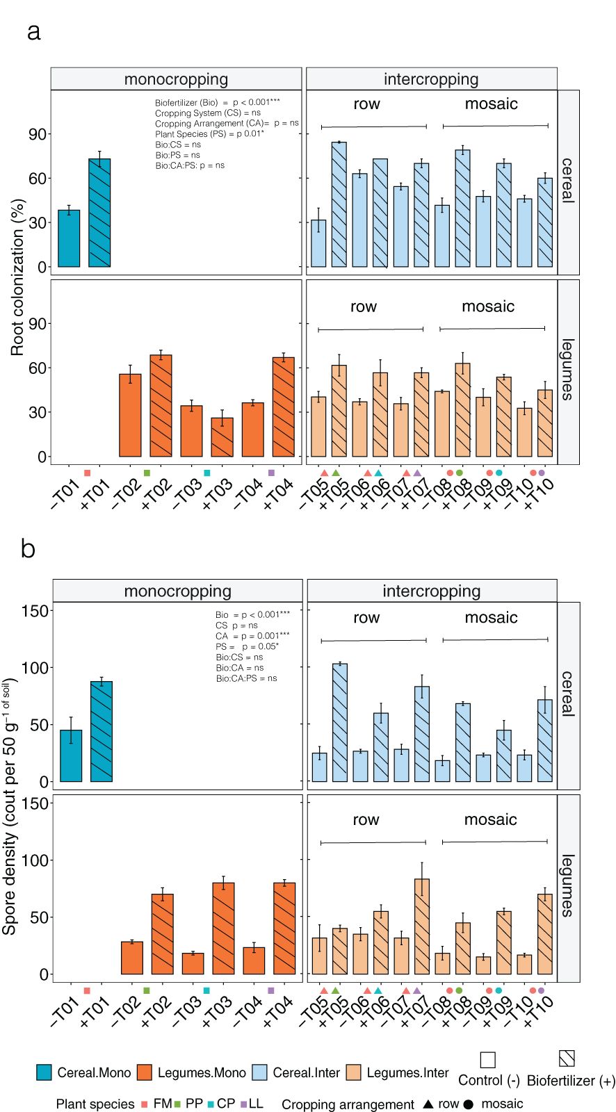 Inoculation with biofertilizers led to a higher root colonization and spore production than observed in the controls independent of cropping system and the spatial arrangement in intercropping during one season in one site, where these variables were assessed. The percentage increase in root colonization after biofertilizers inoculation, despite background colonization, aligns with similar studies from semi-arid tropics (Mäder et al., 2011). However, they are lower than those reported in other studies, such as Bender et al. (2019), who observed up to 66% increase after biofertilizer inoculation compared to controls in maize roots in Swiss fields. AMF are non-host-specific but they generally display host preferences, in which the largest symbiotic responses are achieved by both symbionts when selected plant species are colonized by favored AMF taxa (Bagyaraj, 2014; van der Heijden et al., 2003). The AMF taxa used in this study as well as the PGPRs were previously screened and selected based on their maximum symbiotic responses for some of the crop species used in this study (Mathimaran et al., 2020). Moreover, the combined inoculation of AMF and PGPRs has been also shown to act synergistically and to lead to increased fungal colonization and spore germination (Frey-Klett et al., 2007; Mäder et al., 2011; Hoeksema et al., 2010). Stronger colonization and spore production were expected in intercropping because of the higher plant diversity. However, biofertilizer inoculation resulted in comparable increases in both cropping systems. This may be related to literature reporting that biofertilizers can alter indigenous microbial communities, often reducing native AMF colonization (Janoušková et al., 2017; Bender et al., 2019).