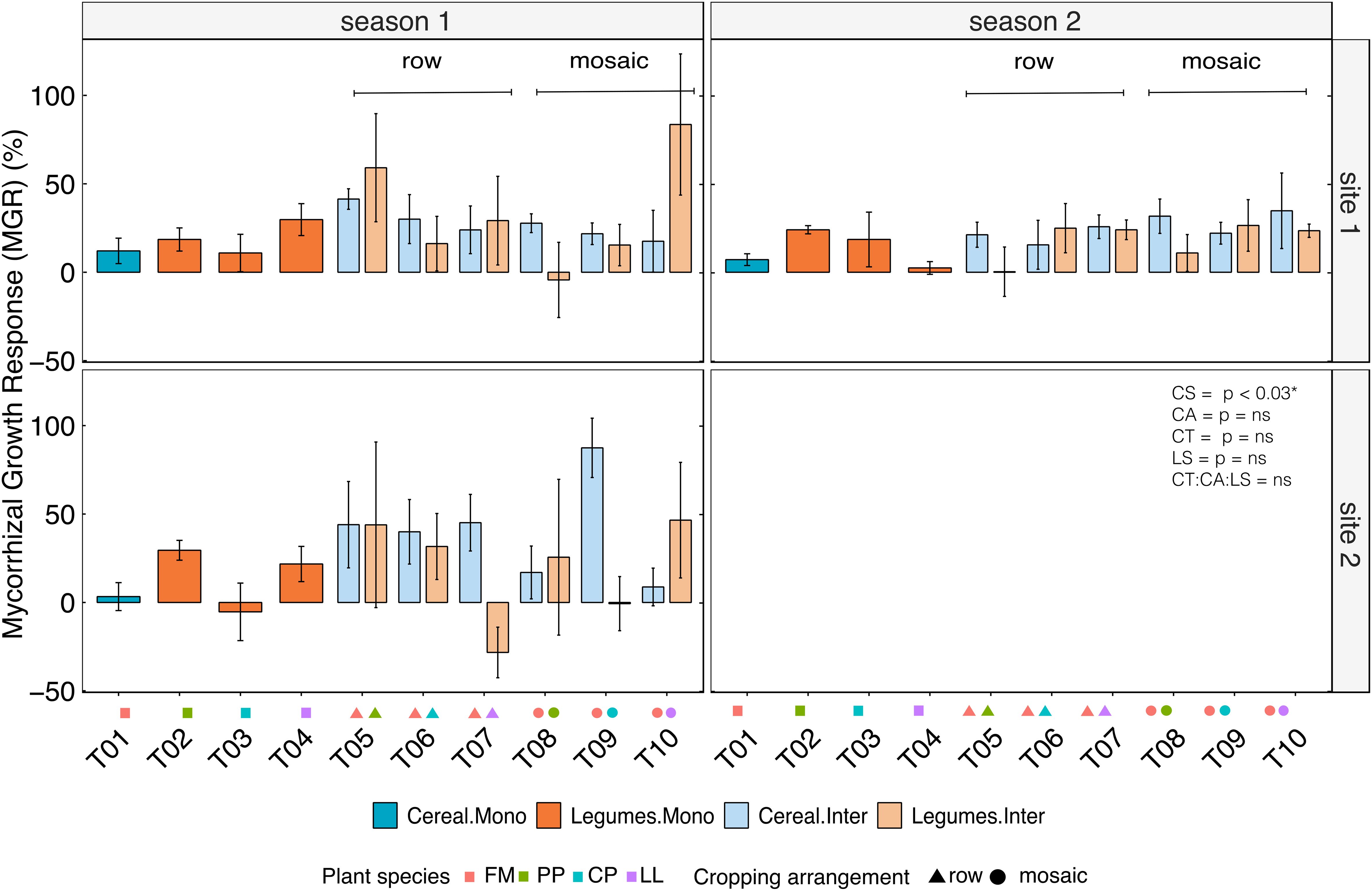 Figure 3. Mycorrhizal Growth Response (MGR) expressed as percent increase in total biomass of finger millet (cereal, blue) and legumes (orange) following biofertilizer inoculation relative to controls. Data represent monocropping (dark shades) and intercropping (light shades) systems across two experimental seasons and two study sites. Species abbreviations as in Figure 1. Error bars show SE.