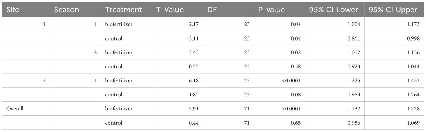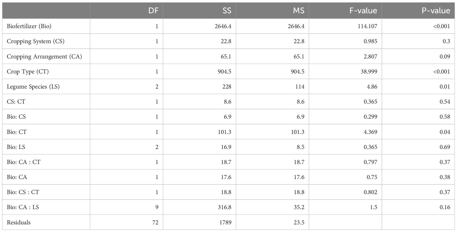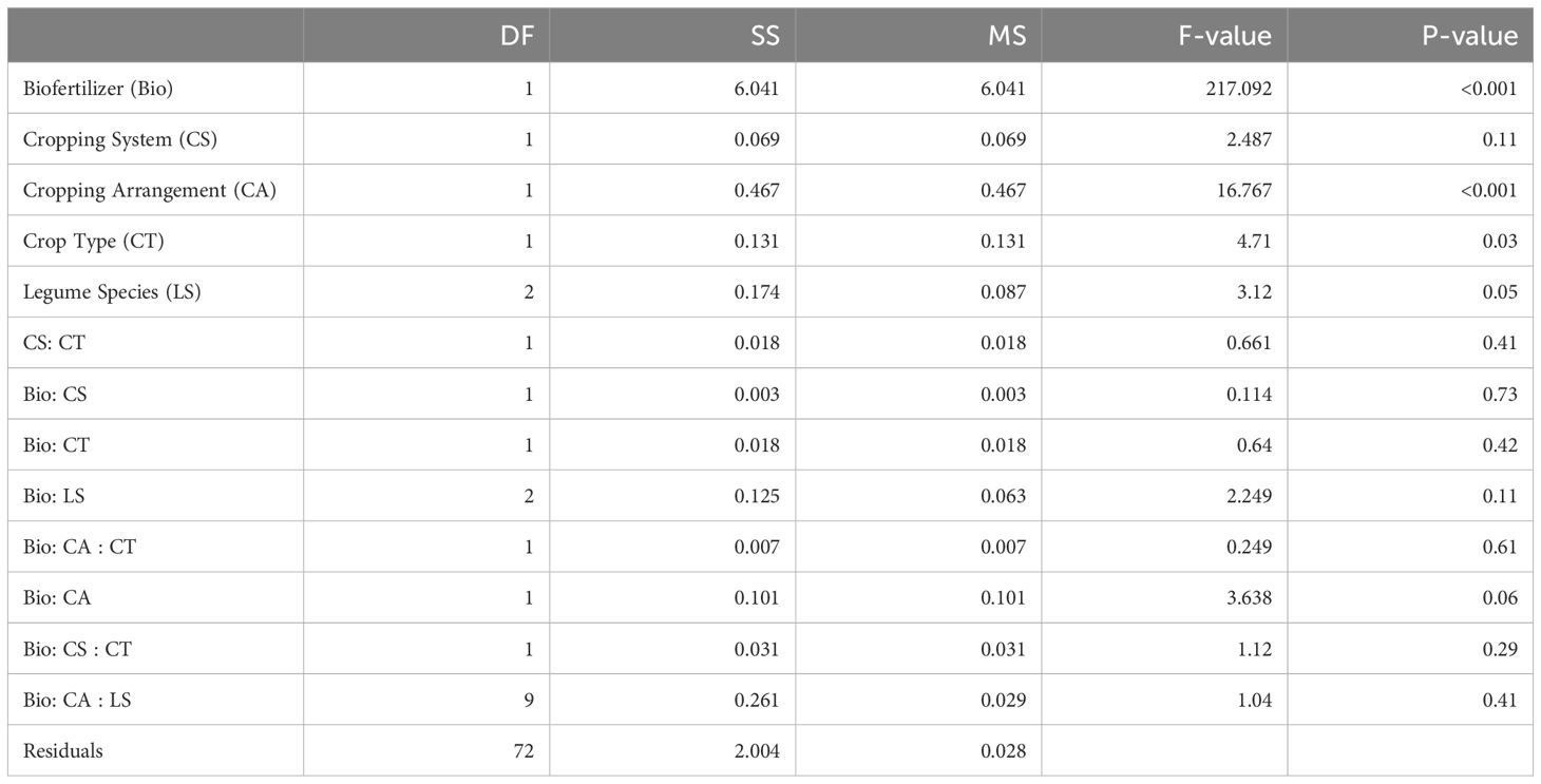 Analysis of Variance (ANOVA) was used to investigate the main effects and interactions between biofertilizer treatment, on yields, LER, CR, MGRs in relation to cropping systems, spatial arrangement, and crop mixtures across sites. Subplot was used as constant-variance random term. Individual Student’s T-tests were used to determine whether LER were significantly different from the null expectation of one. All calculations and analysis were performed in R version 4.1.0 (R Core Team, 2022). Normality assumptions were tested with histograms and plotting standardized residuals.