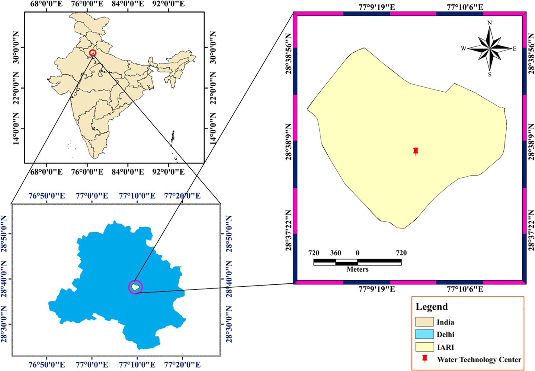 The field experiment was carried out during winter rabi seasons of 2023–24 and 2024–25 at the Precision Farming Development Centre (PFDC), Water Technology Centre, ICAR-Indian Agricultural Research Institute, New Delhi. It is located at 28°37′22″–28°39′00″ North latitude and 77°8′45″–77°10′24″ East longitude with a mean altitude of 230 m above mean sea level (Figure 1). The study was conducted in a semi-arid, sub-tropical climate characterized by hot, dry summers and cold winters. The experimental soil was classified as sandy loam, consisting of 71% sand, 14% silt, and 15% clay. It had a pH of 7.65, an electrical conductivity of 0.29 dS/m, and an organic carbon content of 0.43%. The soil moisture analysis revealed that the experimental site had a field capacity of 24.3% and a permanent wilting point of 7.3% as displayed in Table 1.