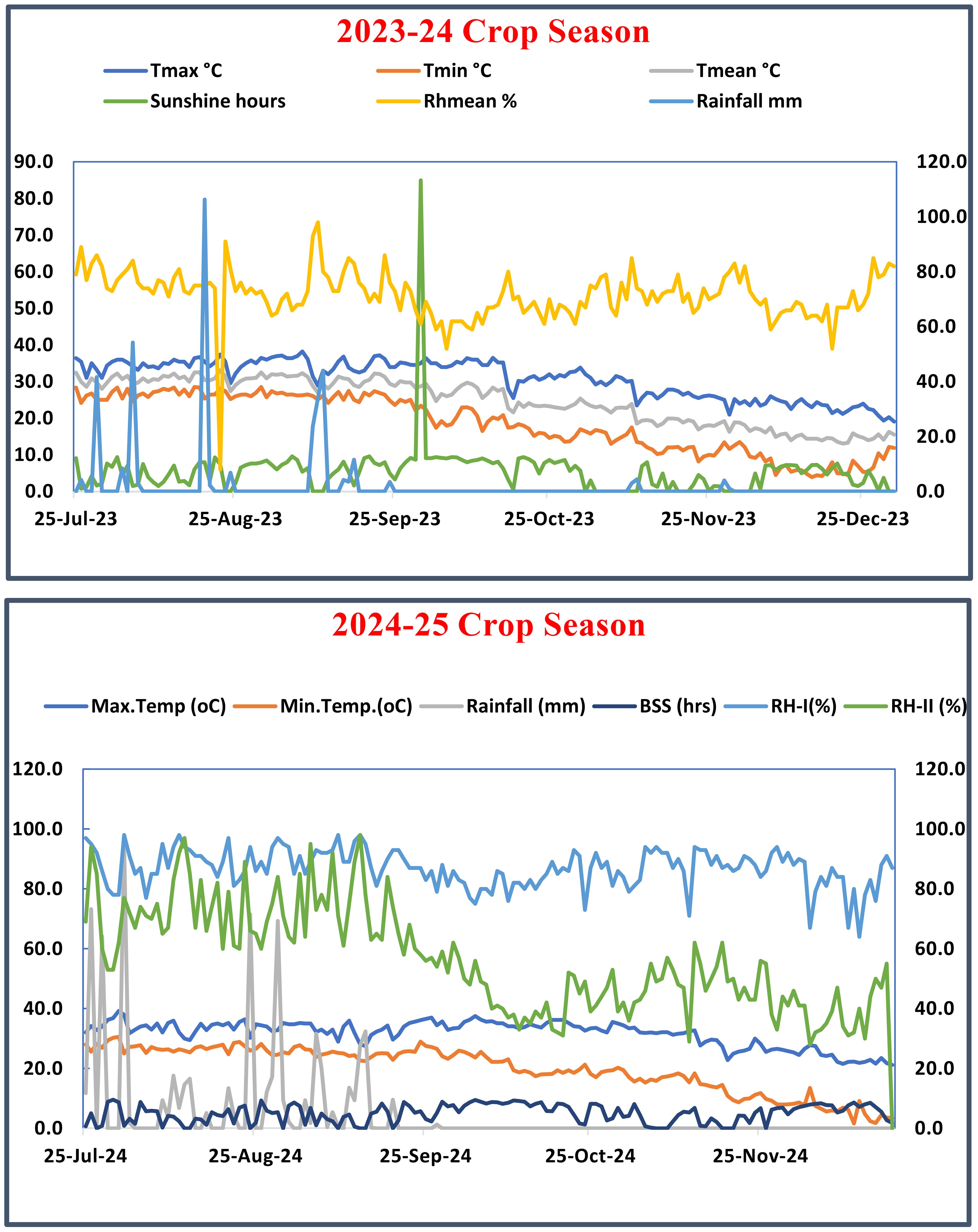 The 31 years (19900-2020) long-term average data revealed that the long-term mean Tmax (30.95 °C) and Tmin (17.66 °C) indicate a moderately warm climate with wide variability (range up to 43.8 °C for Tmax and 37.4 °C for Tmin). The maximum RH (80.6%) shows generally humid conditions, while minimum RH (47.7%) highlights considerable dryness during parts of the year. Mean wind speed (3.93 km/h) and sunshine hours (6.02 h/day) reflect moderate airflow and good solar radiation availability. The average ETo (3.28 mm/day) suggests a moderate evaporative demand, strongly influenced by sunshine and wind speed. Similarly mean monthly maximum and minimum temperatures in 2023–24 were 31.34 °C & 20.47 °C respectively, and 31.90 °C& 20.39 °C in 2024-25, during the crop growth period. The mean monthly maximum relative humidity (RH I) was 87.24% and 87.53% in 2023–24 and 2024–25, respectively, while the minimum relative humidity (RH II) was 60.93% & 57.87% over the same period. Daily Mean sunshine hours fluctuated between 4.45 and 4.96 hours. The mean monthly pan evaporation (PE) values ranged from 3.03 to 2.95 mm. Daily variability of the weather parameters during the experiment period are displayed in Figures 2a, b for 2023-24 and 2024-25 crop seasons, respectively.