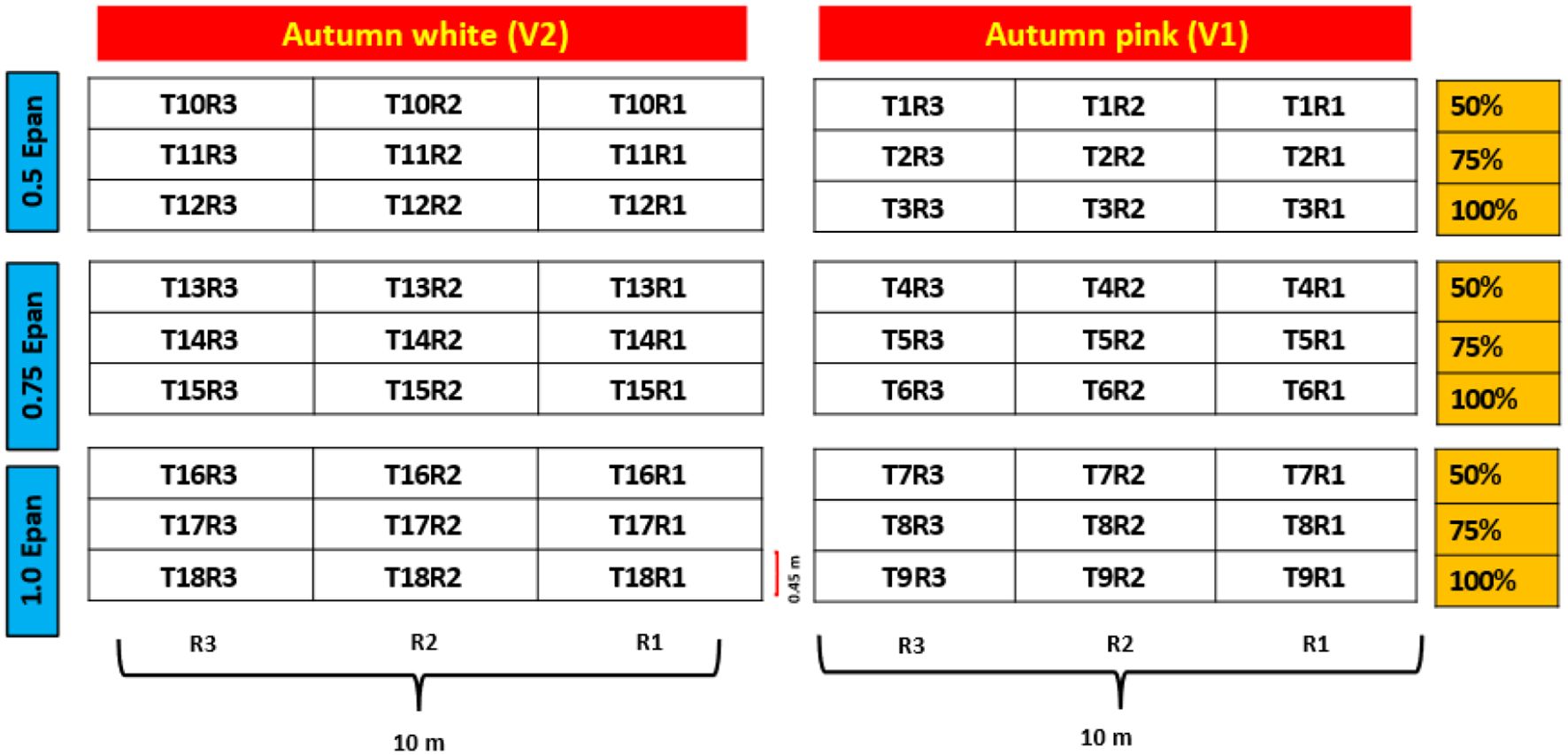 The experiment was laid out in a split-split plot design with 18 treatments and each treatment was replicated thrice. These treatments included two cultivars (autumn pink and autumn white), three irrigation schedules (0.5 Epan, 0.75 Epan and 1.0 Epan) and three fertigation schedules (50%, 75%, and 100% Recommended Dose of Fertilizers). The treatments included T1-Autumn pink + Irrigation Scheduled at 0.5 Epan + 50% RDF (V1I1F1), T2-Autumn pink + Irrigation Scheduled at 0.5 Epan + 75% RDF (V1I1F2), T3-Autumn pink + Irrigation Scheduled at 0.5 Epan + 100% RDF (V1I1F3), T4-Autumn pink + Irrigation Scheduled at 0.75 Epan + 50% RDF (V1I2F1), T5-Autumn pink + Irrigation Scheduled at 0.75 Epan + 75% RDF (V1I2F2), T6-Autumn pink + Irrigation Scheduled at 0.75 Epan + 100% RDF (V1I2F3), T7- Autumn pink + Irrigation Scheduled at 1.0 Epan + 50% RDF (V1I3F1), T8-Autumn pink + Irrigation Scheduled at 1.0 Epan + 75% RDF (V1I3F2), T9-Autumn white + Irrigation Scheduled at 1.0 Epan + 100% RDF (V1I3F3), T10-Autumn white + Irrigation Scheduled at 0.5 Epan + 50% RDF (V2I1F1), T11-Autumn white + Irrigation Scheduled at 0.5 Epan + 75% RDF (V2I1F2), T12-Autumn white + Irrigation Scheduled at 0.5 Epan + 100% RDF (V2I1F3), T13-Autumn white + Irrigation Scheduled at 0.75 Epan + 50% RDF (V2I2F1), T14-Autumn white + Irrigation Scheduled at 0.75 Epan + 75% RDF (V2I2F2), T15-Autumn white + Irrigation Scheduled at 0.75 Epan + 100% RDF (V2I2F3), T16-Autumn white + Irrigation Scheduled at 1.0 Epan + 50% RDF (V2I3F1), T17-Autumn white + Irrigation Scheduled at 1.0 Epan + 75% RDF (V2I3F2), T18-Autumn white + Irrigation Scheduled at 1.0 Epan + 100% RDF (V2I3F3). The layout of the field experiment is displayed in Figure 3.