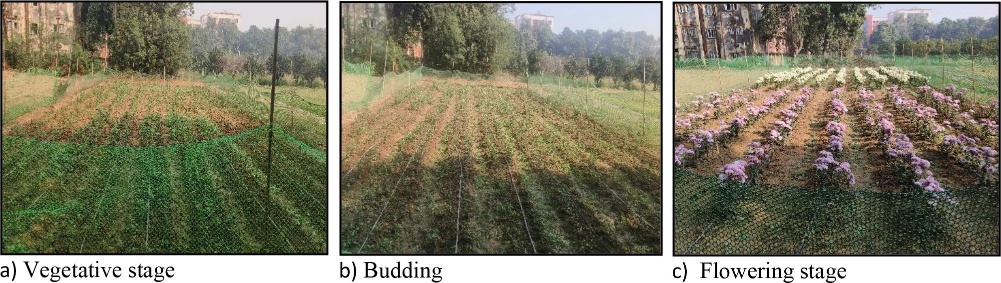 Figure 4. Different crop growth development stages of chrysanthemum [i.e., (a). Vegetative stage, (b). Budding and (c). Flowering stage].