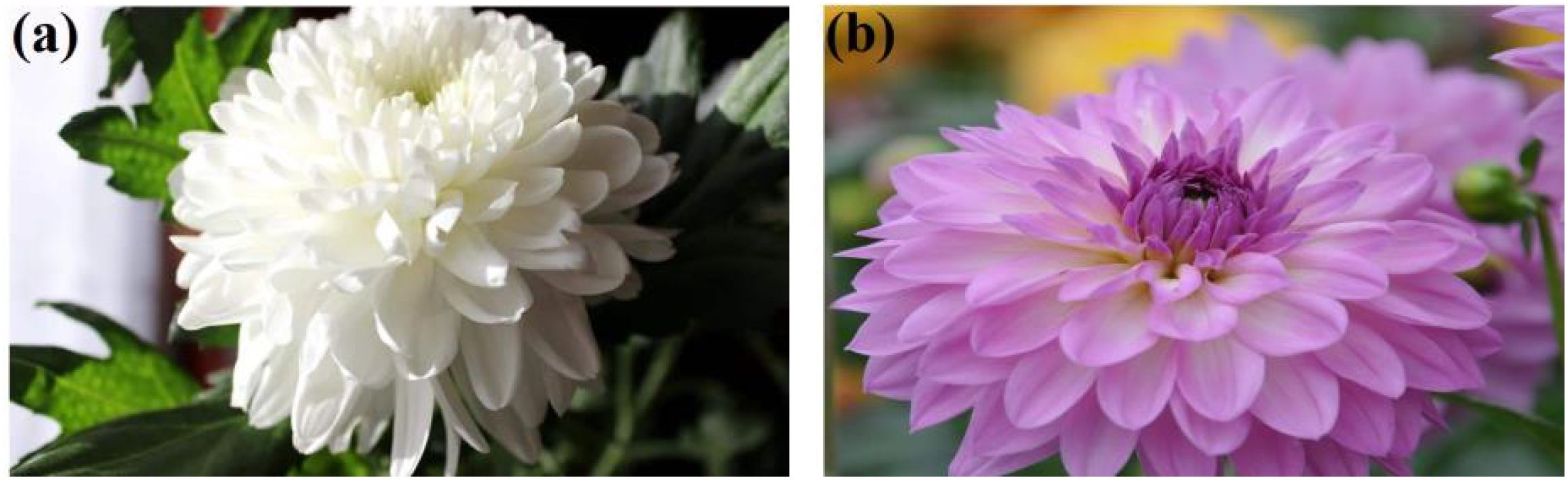 The Autumn White chrysanthemum cultivar (Figure 5a) is a charming fall-blooming cultivar known for its crisp, pure white flowers that add a touch of brightness to autumn gardens. With a dense, mounding growth habit and decorative bloom form, it typically reaches 18 to 24 inches in height and is ideal for borders, containers, or seasonal displays. Its clean white petals may take on a soft ivory tone in cooler weather, offering subtle warmth to fall color palettes. This hardy perennial thrives in full sun and performs best in USDA zones 5 through 9, often returning year after year with proper care and mulching in colder regions. The Autumn Pink chrysanthemum cultivar (Figure 5b), on the other hand, brings a gentle splash of color with its soft to medium pink blooms, sometimes tinged with hints of lavender or rose depending on the temperature. Like its white counterpart, it features a compact, bushy habit and blooms prolifically in mid to late fall, creating a rich, seasonal contrast when planted alongside other mums or ornamental grasses. Its lush green foliage serves as a lovely backdrop to the colorful blossoms, making it a favorite for mixed container arrangements and garden beds alike. Autumn Pink is also hardy in zones 5 to 9 and flourishes in full sun, offering long-lasting beauty and reliable performance in the fall garden. The selected cultivar’s flowers are shown in Figure 5.