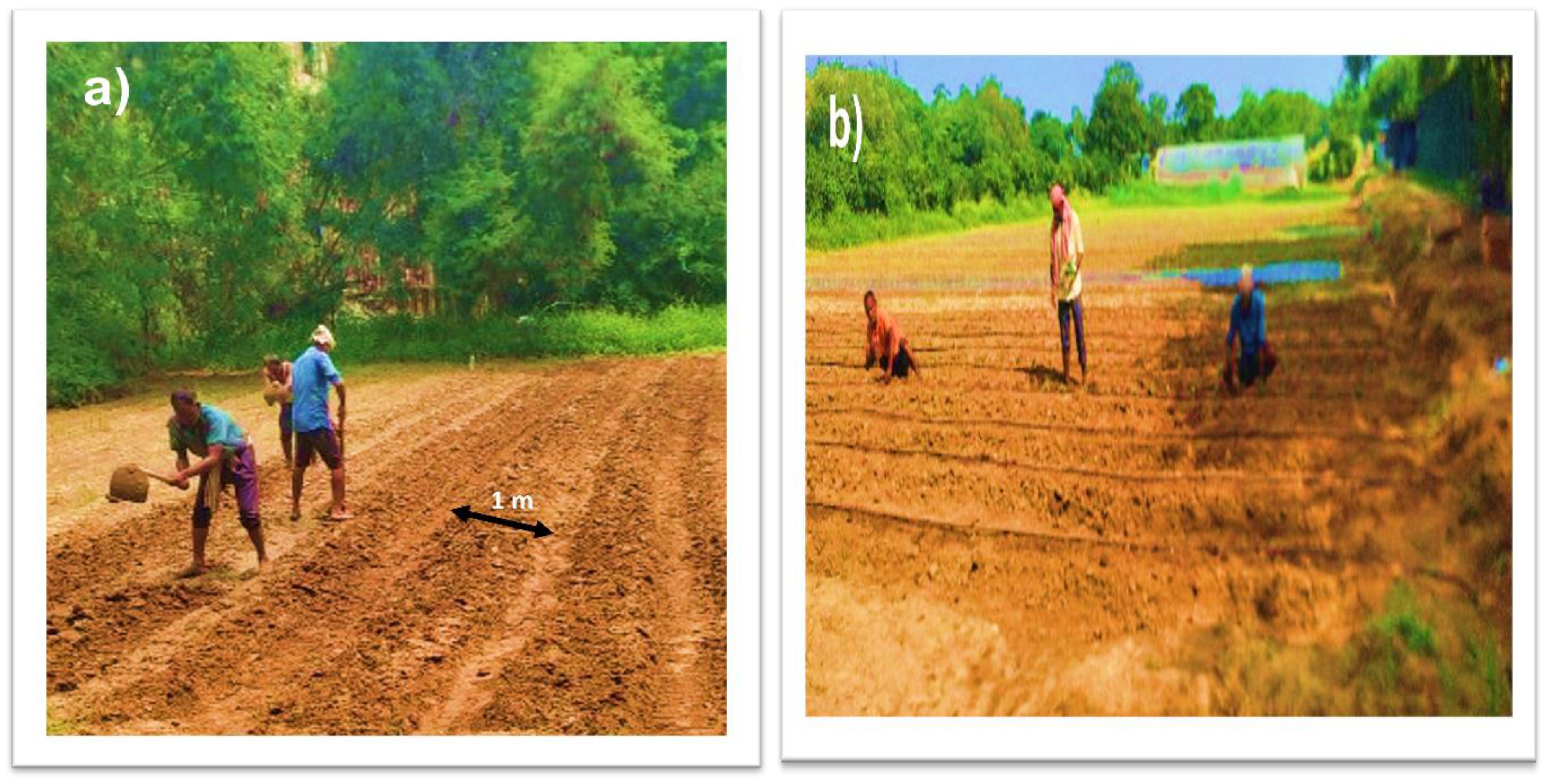 The raised beds prepared for planting were watered to field capacity before transplanting (Figure 6a). Disease free and healthy 40 days old cuttings were transplanted to the field on 24th July in both the cropping seasons. Cuttings were manually planted in paired row planting on either side of the bed in all the treatments. During planting, care was taken such that the plants should be 5 mm below soil without disturbing the root ball. Two rows of cuttings were planted on each bed at 1 m distance between the rows and 30 cm distance between the cuttings (Figure 6b). Around 2000 cuttings were planted on 9 raised beds. A pathway of 1 m was maintained between the beds to facilitate easy movement for cultural operations.