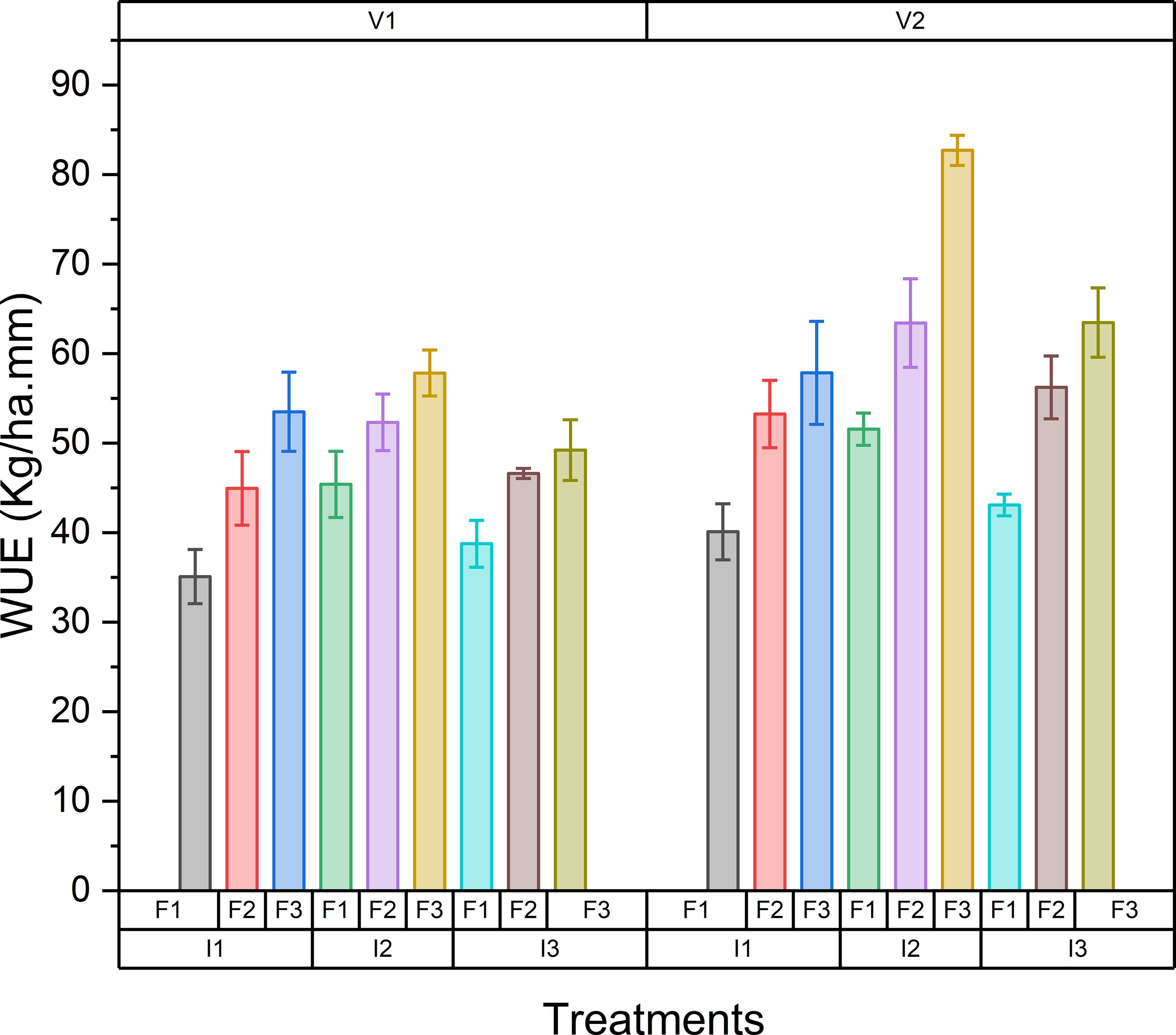 Water use efficiency varied significantly across treatments, influenced by different irrigation and fertigation schedules. Among cultivars, Autumn white (V2) recorded the highest WUE (56.85 kg.ha-1.mm-1) followed by V1 (47.08 kg.ha-1.mm-1) (Table 4 and Figure 7.). Among varied irrigation levels, the highest WUE was recorded with I2 (58.87 kg.ha-1.mm-1) followed by I3 (49.56 kg.ha-1.mm-1) and the lowest was recorded with I1 (47.46 kg.ha-1.mm-1) irrigation levels. However, the total volume of irrigation water applied in I3 was significantly higher than in treatment I2, which has resulted in a lesser WUE in I3 as compared to the I2 treatment. There is an inverse relationship between water use/irrigation amount and WUE. Among different fertigation regimes, the highest WUE was recorded with F3 (60.76 kg.ha-1.mm-1) followed by F2 (52.80 kg.ha-1.mm-1) and the lowest was recorded with F1 (42.33 kg.ha-1.mm-1). However, among all the treatments, the highest pooled WUE was found in treatment V2I2F3 (Autumn white + Irrigation Scheduled at 0.75 Epan + 100% RDF) which recorded (82.71 kg.ha-1.mm-1) which highlights the importance of optimizing irrigation levels for maximum returns. Similarly, the treatment V2I3F3 (Autumn white + Irrigation Scheduled at 1.0 Epan + 100% RDF) also exhibited a strong pooled WUE of (63.47 kg.ha-1.mm-1) followed by V2I2F2 (i.e., 63.42 kg.ha-1.mm-1). In contrast, the treatment (V1I1F1), recorded the lowest WUE, with a pooled average of (35.09 kg.ha-1.mm-1), and these treatments resulted in lower returns compared to treatments with higher irrigation levels. Higher WUE and saving of irrigation water under drip irrigation could be ascribed to minimum water loss through deep percolation, runoff, seepage and soil evaporation as water was applied directly near the crop root zone of the crop in the required quantity. The highest WUE was found in 0.75 Epan (i.e., 58.87 kg.ha-1.mm-1) is indicating comparatively more efficient use of irrigation water. Similar results were reported with Jawaharlal (2017), who revealed that irrigation applied through drip at the rate of 60% E pan recorded significantly higher WUE followed by irrigation at 80% Epan and the significantly lowest WUE was recorded by irrigation given at 100 per cent Epan. The highest WUE was found in the lowest level of irrigation at 60% ET (11.90 t/ha/cm), indicating comparatively the more efficient use of irrigation water. These results agree with Khanam et al. (2017) who concluded in the tuberose crop that higher water use efficiency occurred at lower levels of irrigation, emphasizing the importance of optimizing water application for crop yield. Similar results were also obtained by Banik et al. (2018) and Yadav et al. (2020).