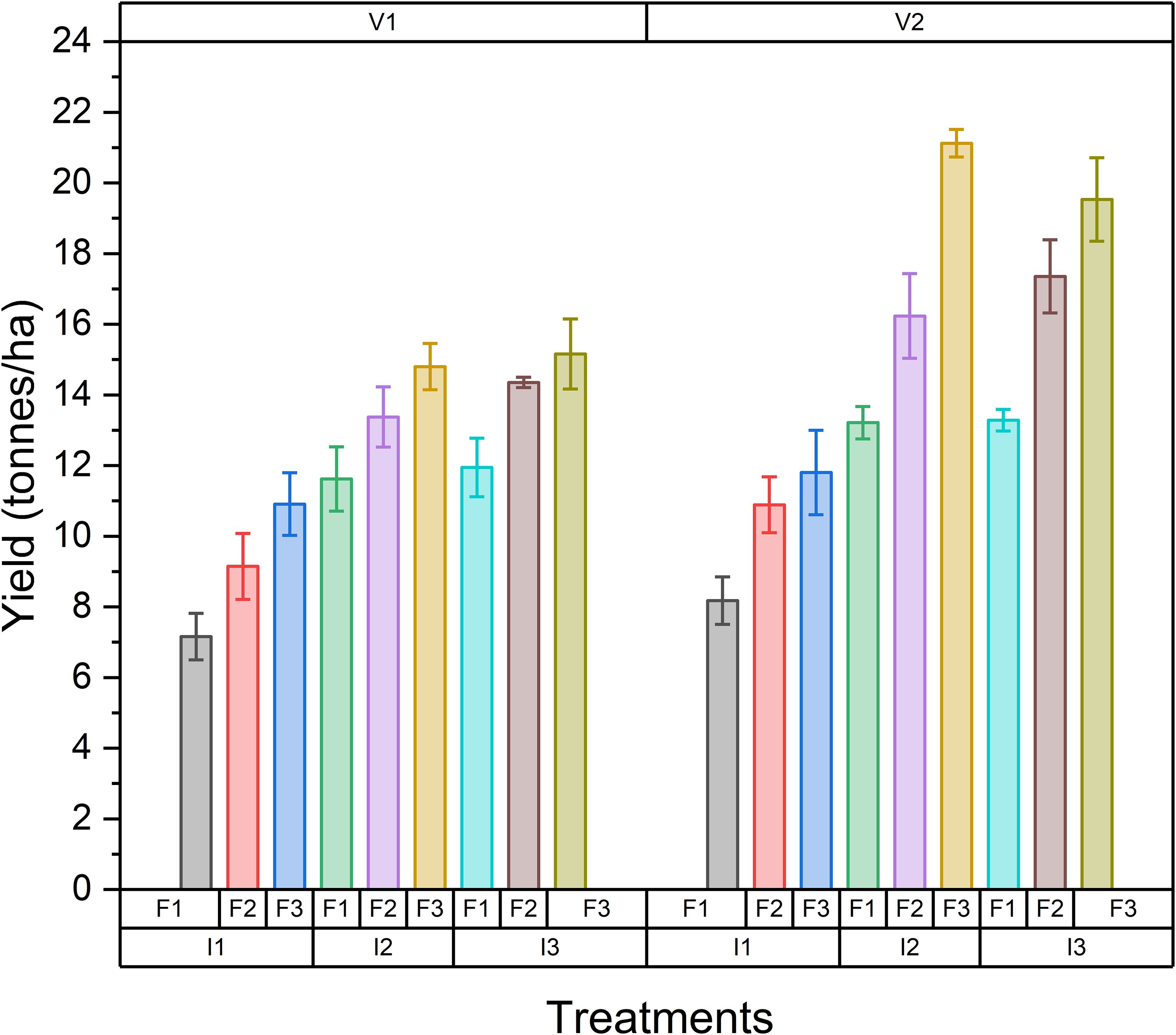 Figure 8. Influence of different cultivars, irrigation and fertigation levels on flower yield (t/ha).