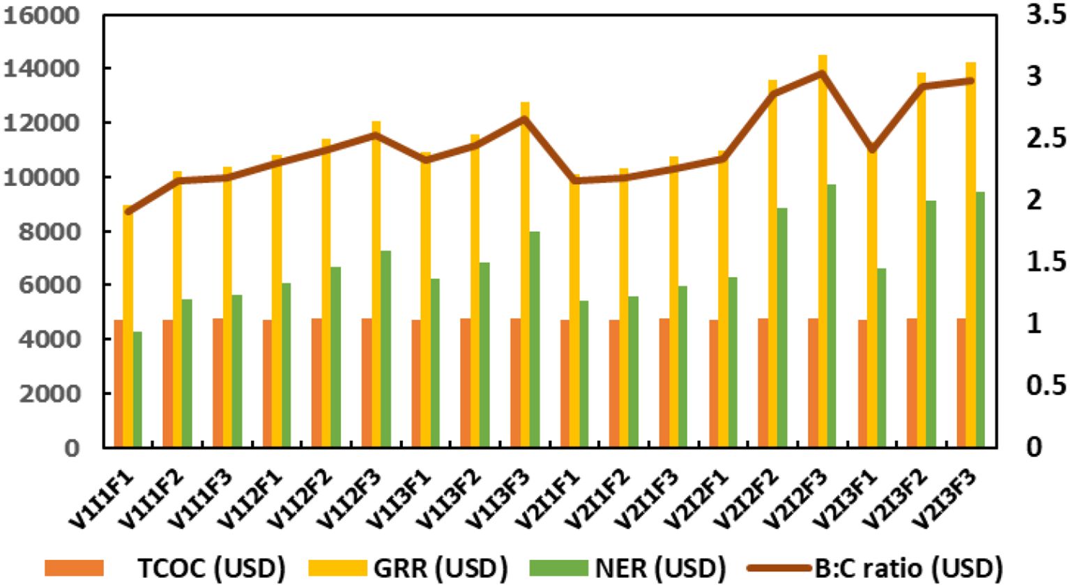 Figure 9. Economic analysis of chrysanthemum influenced by different cultivars, irrigation regimes and fertigation levels.