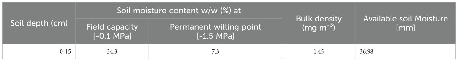 Soil moisture retention capacity of the experimental field was estimated at -0.1 MPa and -15 MPa using pressure plate apparatus and the bulk density of the experimental soil was estimated for 0-15 cm soil depth by following the standard procedure as given below by (Richards, 1954) (Equation 1);