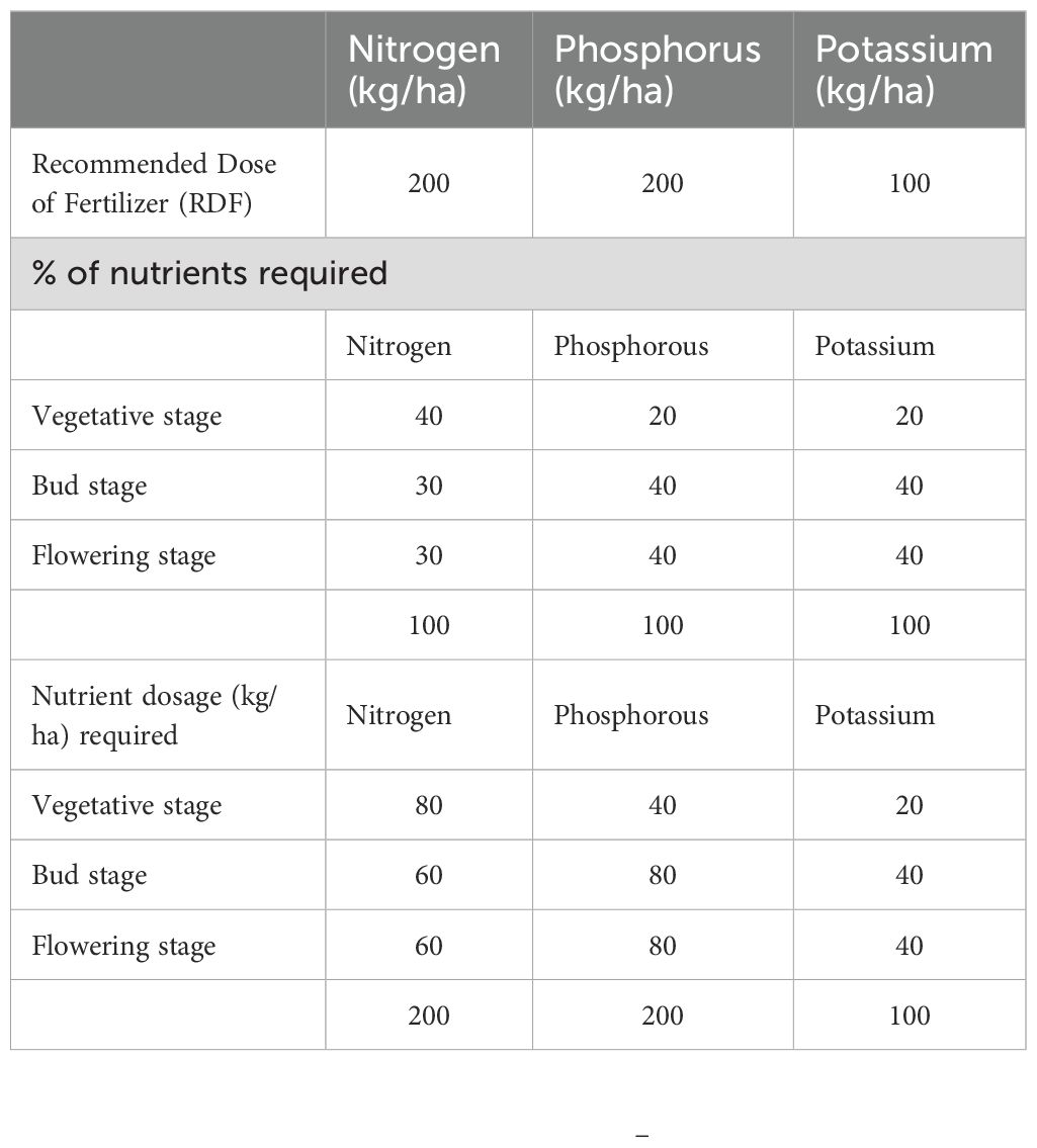 Fertigation was applied using a venturi system every third day, as per the treatments. The fertilizers were applied in 3 equal split dosages at three critical crop growth stages viz., vegetative, budding, and flowering stages as displayed in Figure 4. The sources for nitrogen, phosphorus and potassium nutrients were urea, DAP, and MOP, respectively.