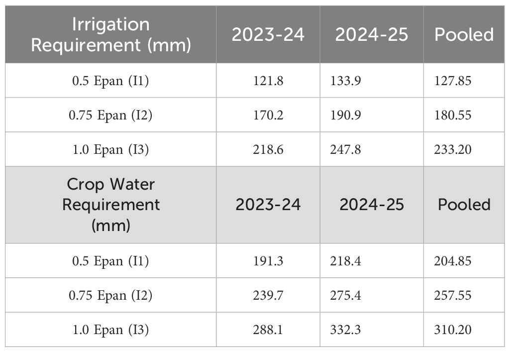 Irrigation scheduling was done based on daily evaporation data recorded from USWB class ‘A’ pan evaporimeter available at the agrometeorological station, ICAR-IARI Farm, New Delhi. Pan evaporation (PE) measures the water evaporated from an open pan, which reflects the atmospheric demand of water. Different levels (e.g., 0.5, 0.75, and 1.0 Epan) were used to determine the amount of irrigation water to apply, reflecting varying irrigation levels. The irrigation requirement under different treatments was 127.85 mm for I1 (0.5 Epan), 180.55 mm for I2 (0.75 Epan), and 233.2 mm for I3 (1.0 Epan) (Table 3). The crop water requirement represents the total amount of water needed by the crop for optimal growth, which includes evapotranspiration (ET) and soil moisture needs. It is influenced by various factors. Thus, it is typically higher than the irrigation water applied, with values of 204.85 mm for I1, 257.55 mm for I2, and 310.20 mm for I3.