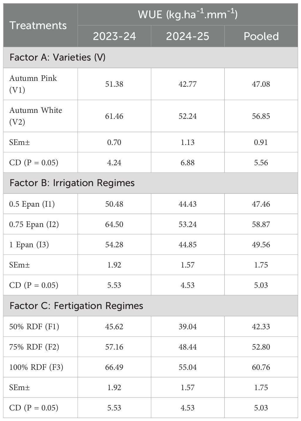 Table 4. Water use efficiency (kg.ha-1.mm-1) of chrysanthemum as influenced by different cultivars, irrigation levels and fertigation regimes during 2023 to 2025 and pooled data.