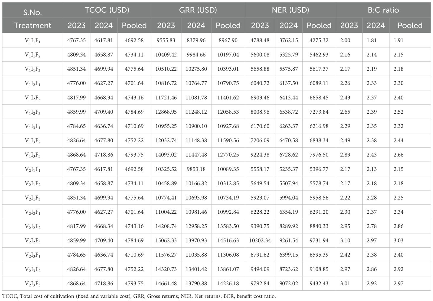 The economic analysis of chrysanthemum cultivation under various cultivars, irrigation regimes, and fertigation levels for the years 2023-24, 2024-25, and the pooled data is presented in (Table 6 and Figure 9). The cost of cultivation varied across treatments due to differences in different cultivars, irrigation and fertigation levels. The lowest cost of cultivation was observed in the V1I1F1 treatment (Autumn pink + Irrigation Scheduled at 0.5 Epan + 50% RDF), with pooled cost of cultivation of 4692.58 USD, while the highest cost of cultivation was recorded in V2I3F3 (Autumn white + Irrigation Scheduled at 1.0 Epan + 100% RDF), with pooled COC of4793.75 USD. The higher cost of cultivation in treatments with higher irrigation and fertigation levels can be attributed to increased input costs for water and fertilizer. Among all the treatments, V2I2F3 (Autumn white + Irrigation Scheduled at 0.75 Epan + 100% RDF) consistently showed the highest gross returns, net returns, and profitability across both the years and pooled data. In the 2023-24 season, the gross returns under V2I2F3 were 15062.33 USD which slightly declined to 13970.93 USD in 2024-25, resulting in a pooled gross return of 14516.63 USD. Net returns for the same treatment were 10202.34 USD and 9261.54 USD for the 2023-24 and 2024-25 years respectively, pooling to 9731.94 USD, reflecting the overall best performance. The higher returns can be attributed to better growth and yield outcomes under the autumn white cultivar along with optimal fertigation and irrigation, enhancing flower quality and quantity. Similarly, V2I3F3 (Autumn white + Irrigation Scheduled at 1.0 Epan + 100% RDF) also exhibited robust economic performance, with the gross returns of 14661.48 USD to 13790.88 USD in 2023-24 and 2024-25 respectively, resulting in a pooled gross return of 14226.18 USD. Net returns for the same treatment were 9792.84 USD to 9072.02 USD for the 2023-24 and 2024-25 years respectively, pooling to 9432.43 USD although slightly lower than V2I2F3, this treatment still demonstrated substantial profitability due to efficient water and nutrient management, making a next best alternative after V2I2F3. In contrast, the treatments with lower irrigation levels and fertigation rates, such as V1I1F1 (Autumn pink + Irrigation Scheduled at 0.5 Epan + 50% RDF) recorded the lowest returns. In 2023-24, the gross returns for V1I1F1 were 9555.83 USD, which decreased to 8379.96 USD in 2024-25, yielding a pooled gross return of 8967.90 USD. Due to lower flower yield and quality under least irrigation and fertigation, net returns for this treatment remained considerably lower, for both the years (i.e., 4788.48 USD and 3762.15 USD) with pooled net returns of 4275.32 USD. Among all the treatments, the highest pooled B:C ratio was observed in V2I2F3 (Autumn white + Irrigation Scheduled at 0.75 Epan + 100% RDF) which recorded a ratio of 3.03. This high value reflects the combined benefits of increased water and nutrient availability leading to better yields and profitability. The strong performance of the V2I2F3 treatment highlights the importance of optimizing irrigation and fertigation levels for maximum returns. Similarly, the treatment V2I3F3 (Autumn white + Irrigation Scheduled at 1.0 Epan + 100% RDF) also exhibited a strong pooled B:C ratio of 2.97 followed by V2I3F2 (i.e 2.92). This treatment, V2I3F3 (Autumn white + Irrigation Scheduled at 1.0 Epan + 100% RDF) is the second best option, reinforcing the trend that higher input levels, when managed efficiently, lead to better profitability. On the other hand, treatments with lower input levels, particularly V1I1F1, recorded the lowest B:C ratio, which had a pooled B:C ratio of 1.91, showing that these configurations are less profitable despite having lower costs of cultivation and these treatments resulted in lower returns compared to treatments with higher fertigation and irrigation inputs.