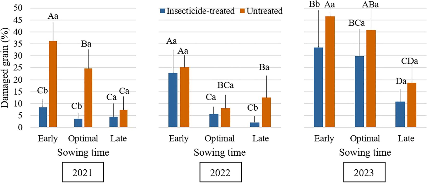 Figure 1. Mean percentage of Bruchus rufimanus-damaged grains across sowing times during the 2021–2023 growing seasons under insecticide-treated and untreated conditions. Different capital letters indicate significant differences of damaged grain at different sowing times under insecticide-treated or untreated treatment in the same year in 2021-2023 (Tukey test, P<0.05). Different lowercase letters indicate significant differences of damaged grain between the treatments of insecticide-treated and untreated under the same sowing time in the same year in 2021-2023 (Tukey test, P<0.05).