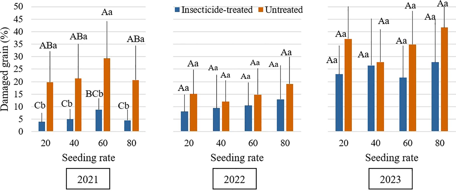 Figure 2. Mean percentage of Bruchus rufimanus-damaged grains across seeding rates during the 2021–2023 growing seasons under insecticide-treated and untreated conditions. Different capital letters indicate significant differences of damaged grain at different seeding rates under insecticide-treated or untreated treatment in the same year in 2021-2023 (Tukey test, P<0.05). Different lowercase letters indicate that the statistically significant differences of damaged grain between the treatments of insecticide-treated and untreated under the same seeding rate in the same year in 2021-2023 (Tukey test, P<0.05).