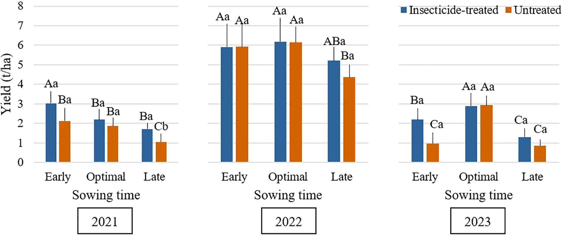 Figure 3. Influence of sowing time and insecticide application on grain yield (t/ha) of faba bean during the 2021–2023 growing seasons. Different capital letters indicate significant differences of yield at different sowing times under insecticide-treated or untreated treatment in the same year in 2021-2023 (Tukey test, P<0.05). Different lowercase letters indicate significant differences of yield between the treatments of insecticide-treated and untreated under the same sowing time in the same year in 2021-2023 (Tukey test, P<0.05).