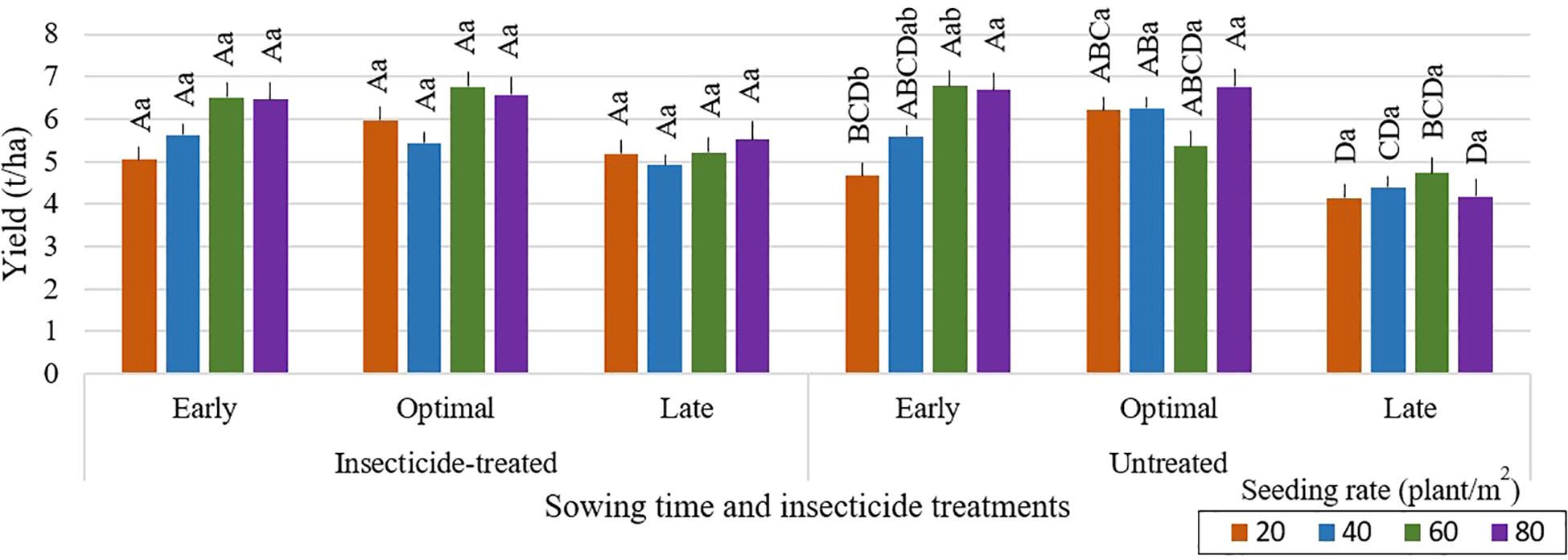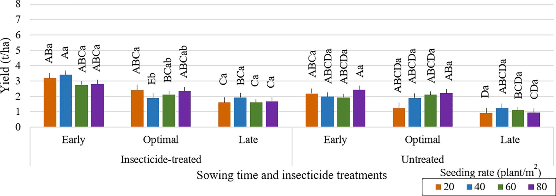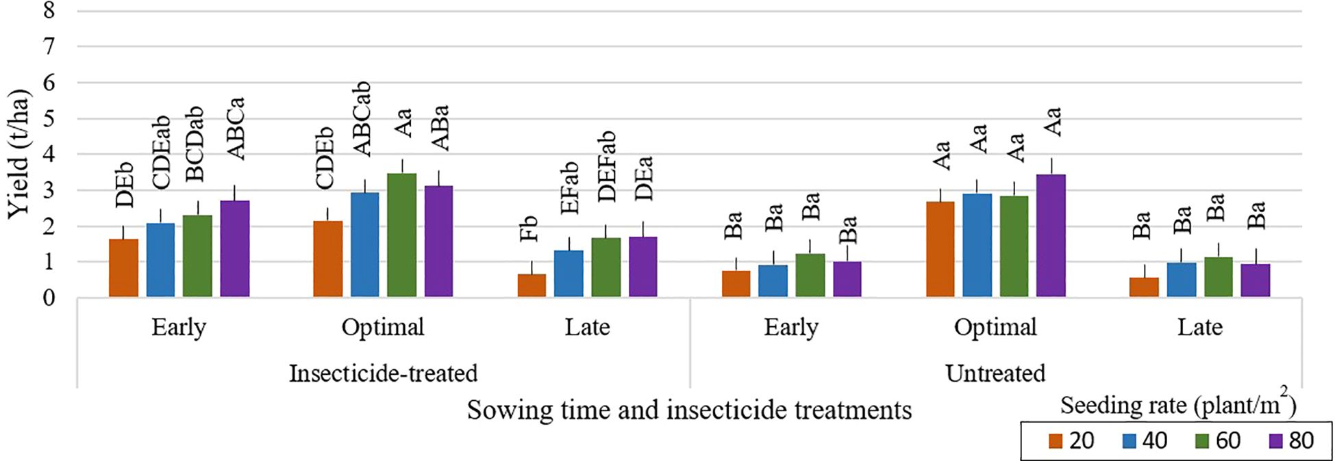 Figure 5. Faba bean grain yield (t/ha) across different sowing times and insecticide treatments at various seeding rates during the 2022 growing season. Different capital letters indicate significant differences of yield between different seeding rates under insecticide-treated or untreated treatment (Tukey test, P<0.05). Different lowercase letters indicate significant differences of yield between the different seeding rates under the same sowing time (Tukey test, P<0.05).