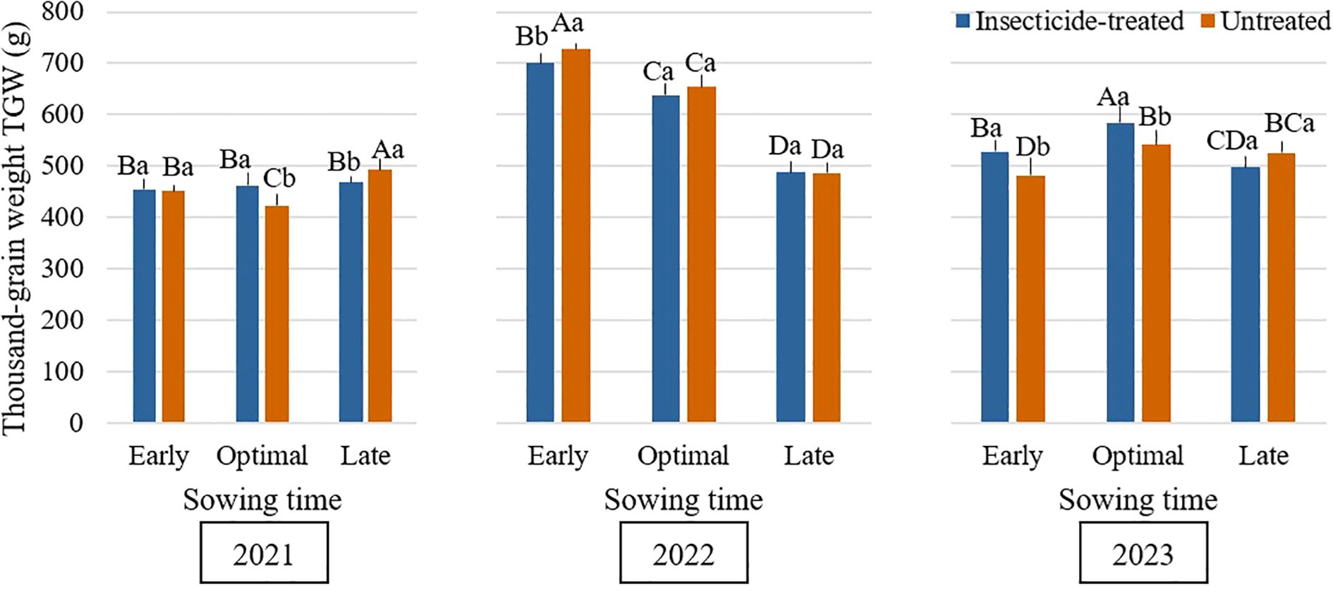 The most significant differences were noticed when comparing different sowing times. In 2021, untreated plots sown at the late sowing time had the highest TGW (492.5g on average) compared to early and optimal sowing time (Figure 7). In contrast, early sowing time treatments had the maximum TGW in 2022, with treated plots weighing 700.1g and untreated plots weighing 726.7g on average and it significantly decreased with each sowing time. In 2023, optimal sowing time resulted in the highest TGW compared to early and late sowing times, with treated plots averaging 584.6g and untreated plots averaging 541.9g. All three years demonstrated different results. There was no consistent pattern in TGW when evaluating insecticide-treated and untreated plots at different sowing times. (Anwar et al., 2015) also have noticed differences in TGW between different sowing times – TGW decreased with later sowing times as compared to earlier ones.
