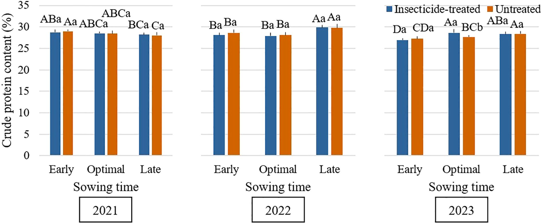 Figure 8. Influence of sowing time and insecticide application on crude protein (CP) content (%) of faba bean during the 2021–2023 growing seasons. Different capital letters indicate significant differences of crude protein (CP) content at different sowing times under insecticide-treated or untreated treatment in the same year in 2021-2023 (Tukey test, P<0.05). Different lowercase letters indicate significant differences of crude protein (CP) content between the treatments of insecticide-treated and untreated under the same sowing time in the same year in 2021-2023 (Tukey test, P<0.05).