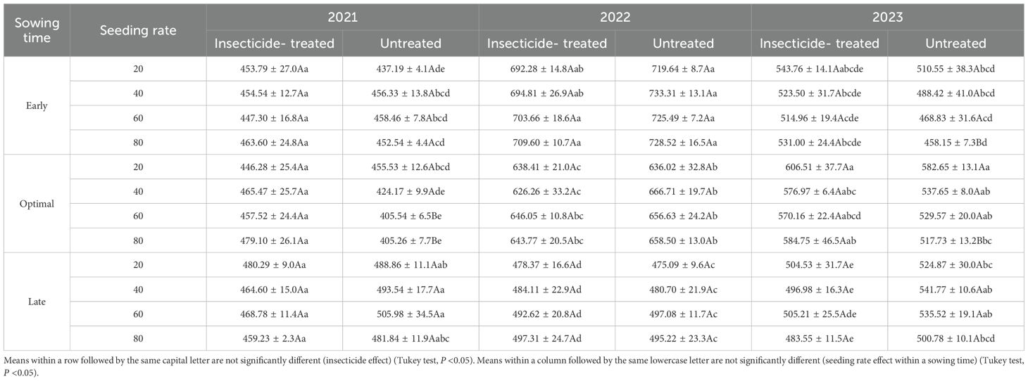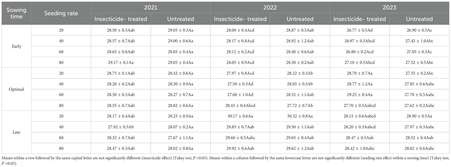 Table 2. Impact of seeding rate and sowing time on thousand-grain weight (TGW, g) of faba bean under the insecticide treated and untreated treatments in the same year in 2021-2023.