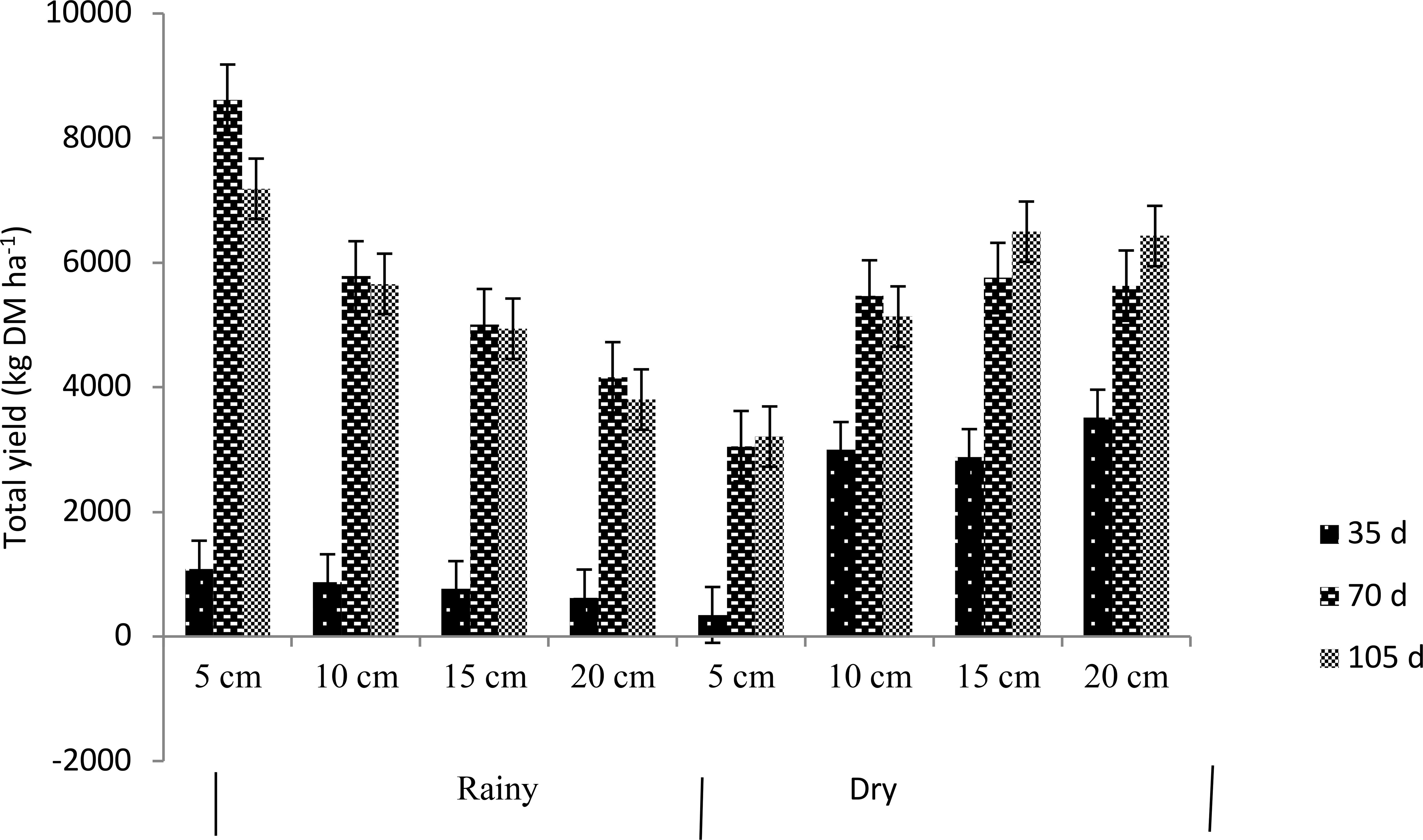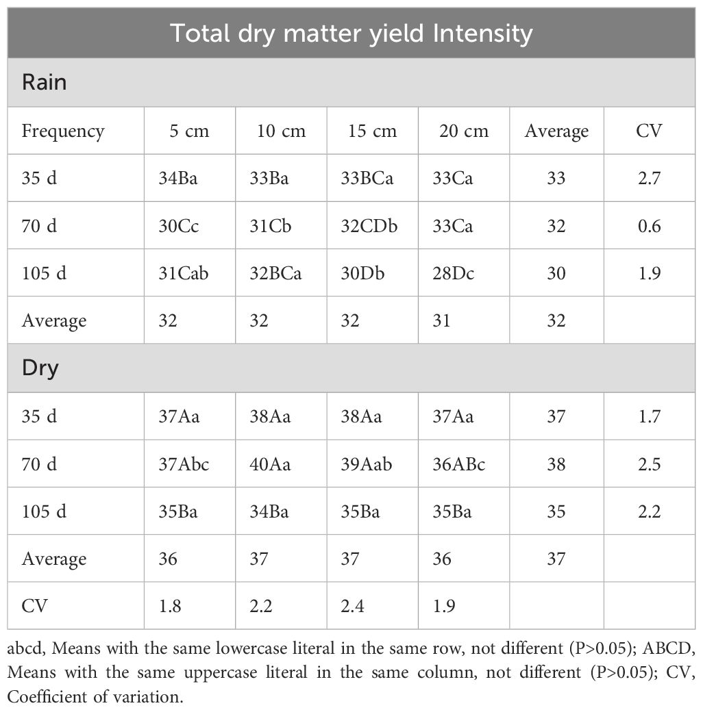Figure 1 presents the averages of total dry matter yield by rainy and dry season. A difference (p<0.05) was found between rainy and dry seasons, in the rainy season, the highest yields occurred in the 70-days with 5892 kg of dry matter (DM) and, lower value 836 kg DM ha-1 in 35-day. In rainfall, the average DM yield was reduced from 5630 to 2863 when intensity decreased from 5.0 cm to 20 cm due to a more significant amount of residual biomass left as a remnant. At both times of the year, the highest biomass yields occurred at the frequencies of 70 and 105 days, 5644 and 5147 kg DM ha-1 in rain and dry, respectively (p<0. 05). The lowest values occurred at the frequency of 35 days for the seasons above with values of 836 and 2433 kg DM ha-1 in rain and dry, same order; the higher value in the dry may be because when cutting the CHP plants in the rain, this stimulated a more significant emission of shoots by the plants and, with it a higher dry matter yield.