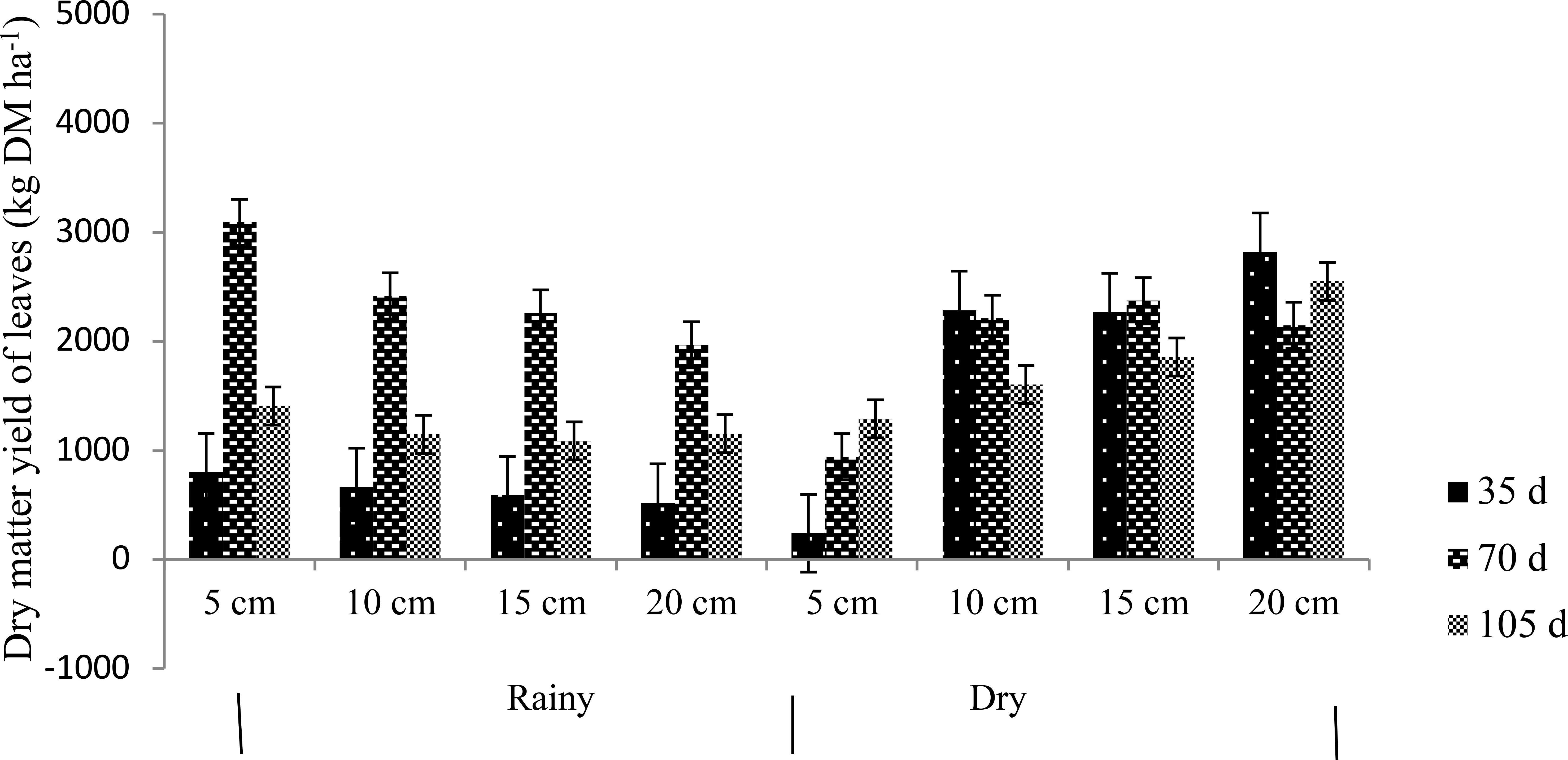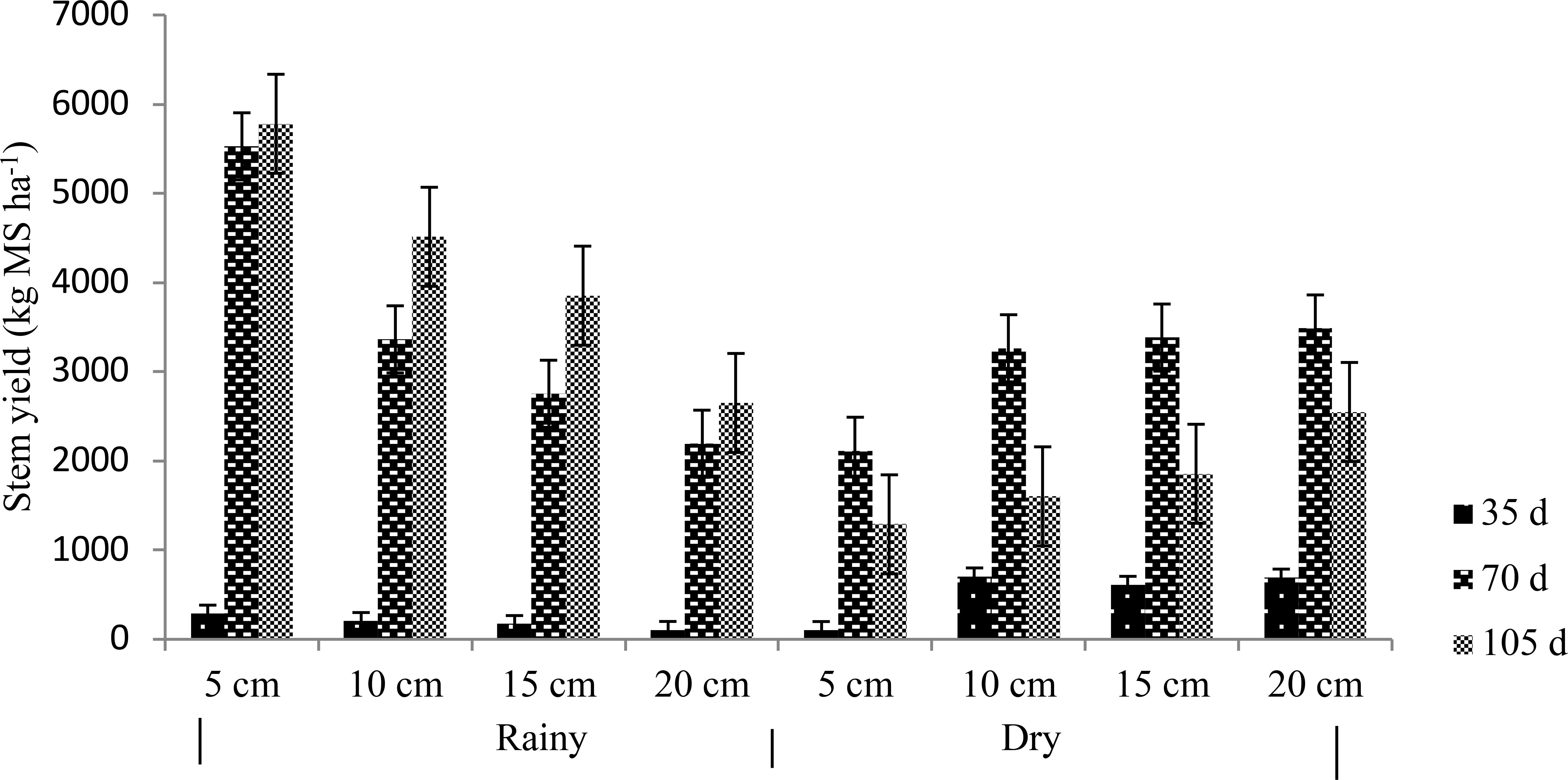 Stem DM yields are shown in Figure 3; a difference was found (p<0.05) between seasons; regardless of the cutting intensities the highest yield 4199 kg DM ha-1 occurred in the rainy season in the 105-days frequency; with a lower yield of 194 kg DM in 35 days. However, in the dry season the highest yield of 3061 kg DM occurred at 70 days and the lowest value 530 kg at 35 days. When comparing yields between cutting intensities during the rainy season, they decrease as the intensity decreases from 3866 to 5 cm and 1650 kg DM at 20 cm, this behavior did not occur in the dry season, possibly due to the effect of previous cuts made to the plants. This is due to a large number of stems remaining on the plants at the lower intensities.
