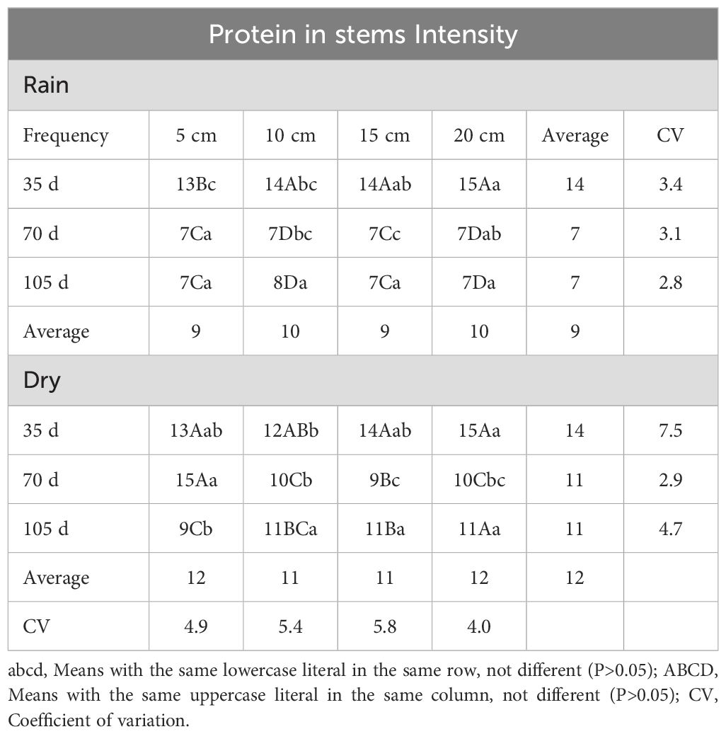 The means of crude protein content in stems (CPC) are shown in Table 2 for the rainy and dry seasons; differences were found (p<0.05) in both seasons because of treatments, with the highest protein content of 14% at the frequency of 35 days in both rainy and dry seasons, and the lowest value of 7% occurred at 70 and 105 days in the rainy season. The protein values between intensities within the season showed no variations (p>0.05) with average contents of 9% in the rainy season and 11.5% in the dry season. The average protein content of the rain represented 75% of that achieved in the dry period The above indicates that, at an age greater than 70 days of the stems, they do not present attractive attributes as food for humans or ruminants, because the intracellular content is reduced by increasing the crude fiber, affecting the digestibility of the stems.