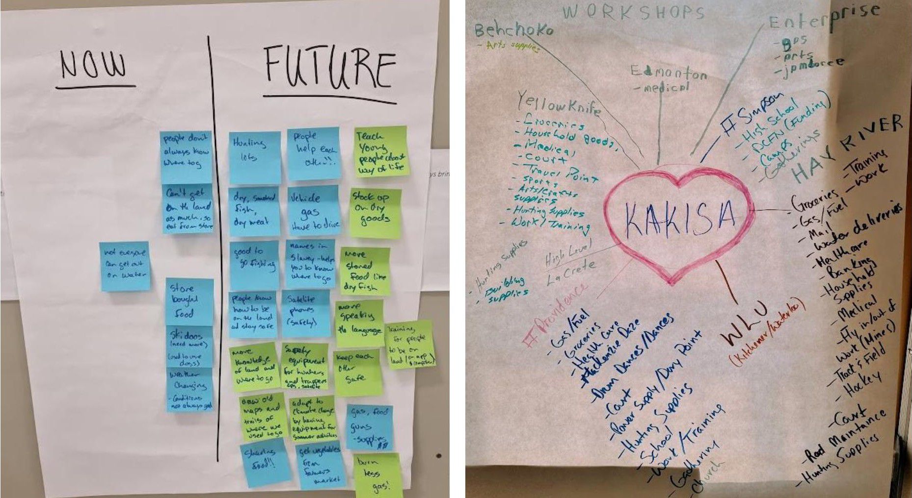 During the June 2023 workshop in Kakisa, 15 community members (approximately half of all adults) participated in three activities to describe their current food system and future vision: Community Visioning (Lachapelle et al., 2010), Community Asset Mapping (Kramer et al., 2012), and World Café1 (Recchia et al., 2022). During the ‘visioning’ activity community members wrote and drew on Post-it notes, indicated in the following section using quotes and italics, that describe positive and negative food system attributes and placed them in the ‘now’ category. Next, they identified all the existing positive food system attributes and moved those notes to the ‘future’ category. Finally, community members added attributes or descriptions of their desired future food system.