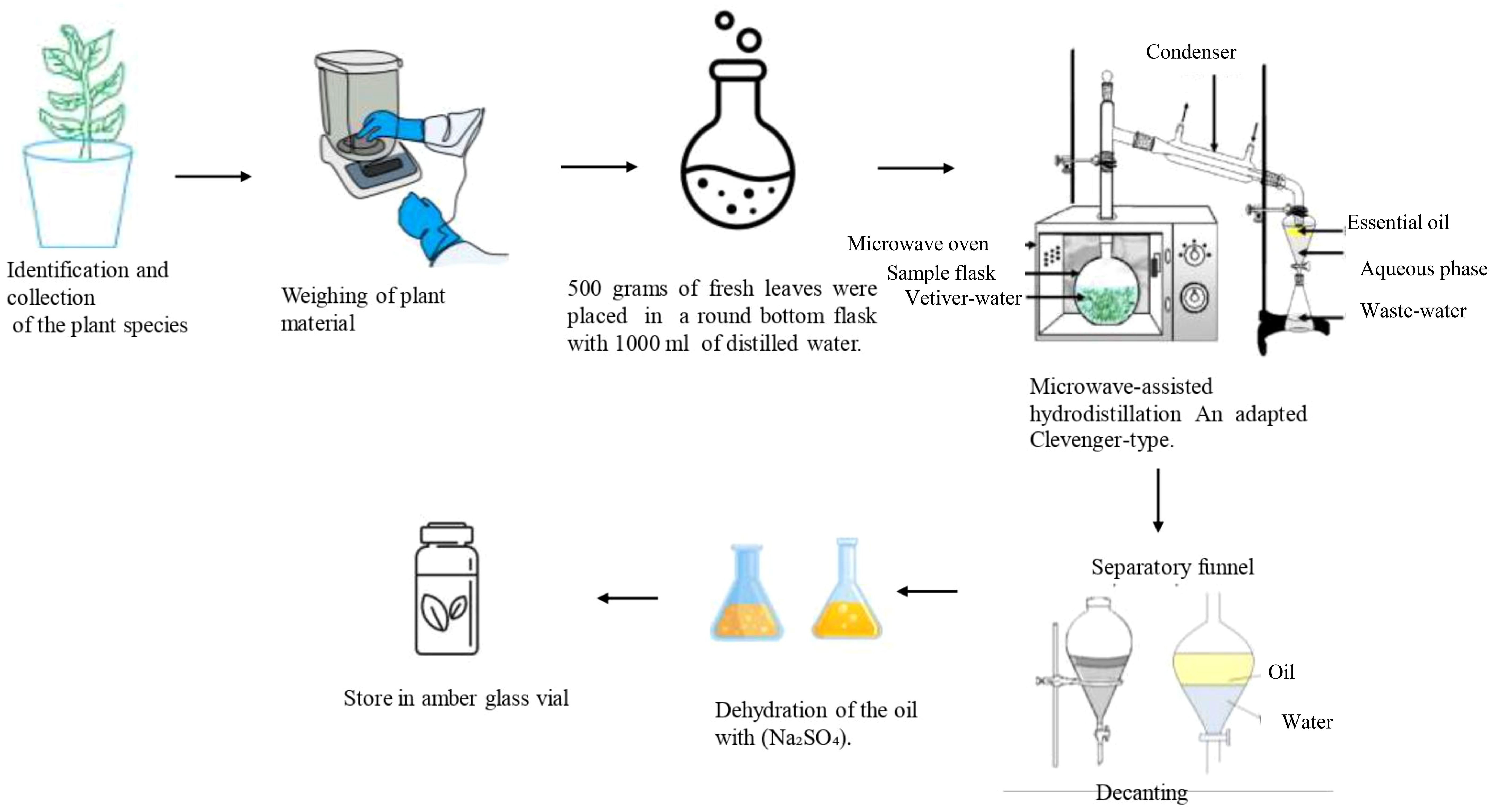 Essential oil was obtained via microwave-assisted hydrodistillation with saturated steam at atmospheric pressure, following Dezfooli et al. (2012). An adapted Clevenger-type apparatus was used in conjunction with a standard household microwave oven (Samsung MW1235WB, 2450 MHz) set at 70% power. A weight-to-volume ratio of 1:2 was applied, with 500 g of fresh leaves placed in a round-bottom flask containing 1,000 ml of distilled water. The extraction was carried out for 120 min, yielding 0.0095% (w/w). The oil was separated by decantation, dehydrated with anhydrous sodium sulfate (Na2SO4), and stored in amber glass vials at 4 °C until further analysis (Figure 1).