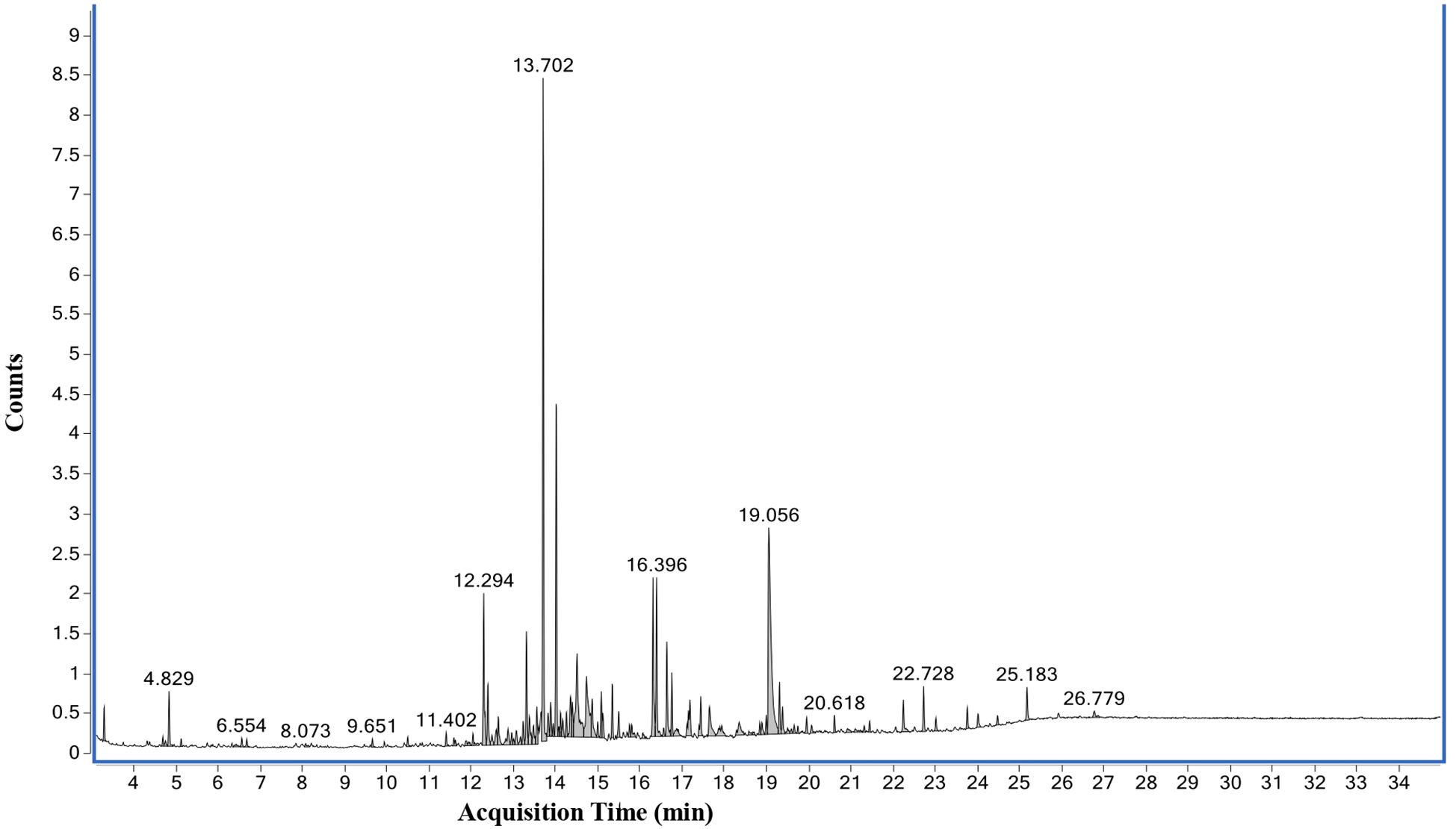 Figure 2. Chromatogram of the essential oil of Tridax coronopifolia var. alboradiata obtained by gas chromatography–mass spectrometry (GC-MS).