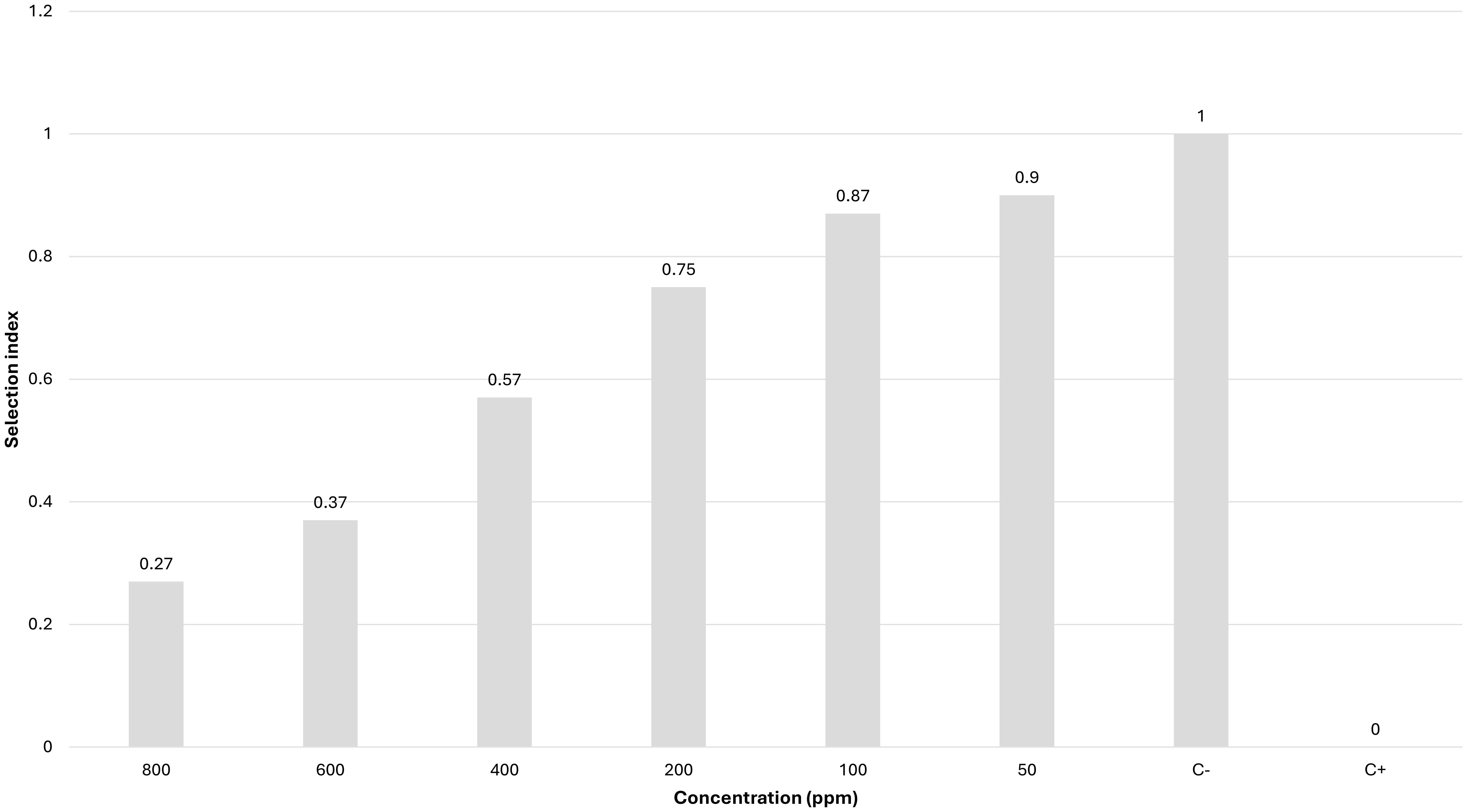 Repellency increased with oil concentration, as indicated by the decreasing number of weevils in treated maize containers. At the highest concentration (800 ppm), the SI was 0.27 (F = 197.64, df = 7.24, p < 0.001, r² = 0.9829), with 86.25% of weevils found in untreated maize. Concentrations of 600 and 800 ppm (SI = 0.37 and 0.27, respectively) were classified as having high repellent activity (0.25 ≤ SI ≤ 0.49). At the lowest concentration (50 ppm), the SI was 0.90, indicating low repellency (0.75 ≤ SI ≤ 0.99), with 55.00% of weevils in untreated maize. All concentrations of T. coronopifolia var. alboradiata essential oil exhibited repellency against S. zeamais, whereas the positive control (commercial chemical repellent) demonstrated very high repellency (Table 2; Figure 3).