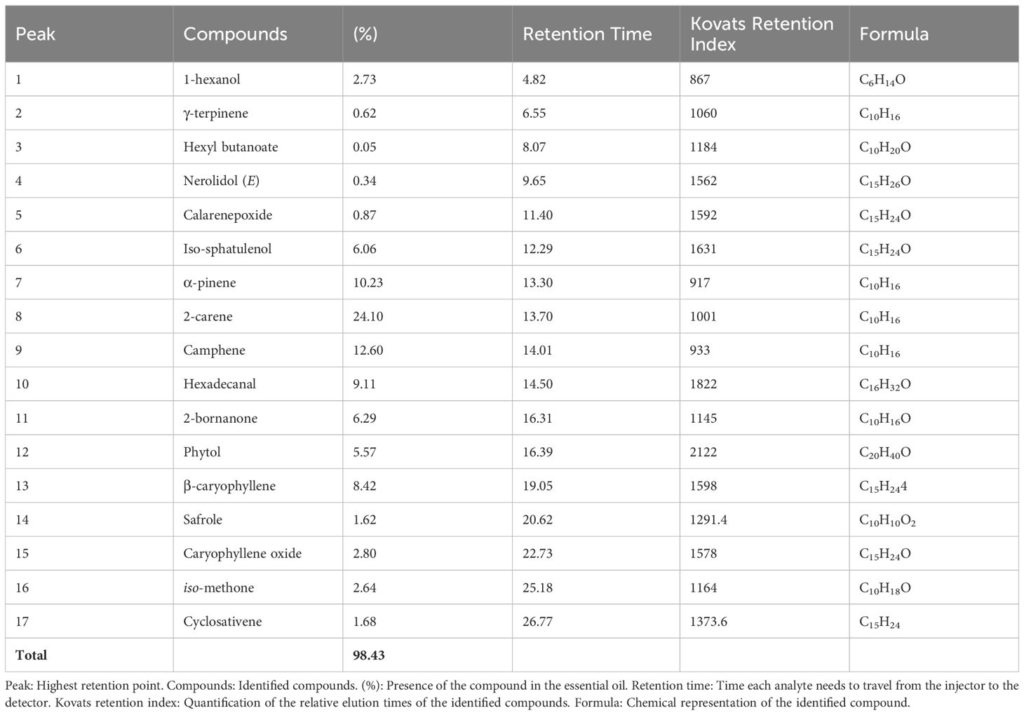 Gas chromatography–mass spectrometry analysis of T. coronopifolia var. alboradiata essential oil identified 16 terpenes, representing 98.43% of the total composition (Table 1). The extraction yielded 800 μL of oil. The predominant constituents were 2-carene (24.1%), camphene (12.6%), α-pinene (10.23%), hexadecanal (9.11%), β-caryophyllene (8.42%), 2-bornanone (6.29%), iso-sphatulenol (6.06%), phytol (5.57%), and caryophyllene oxide (2.80%) (Figure 2).